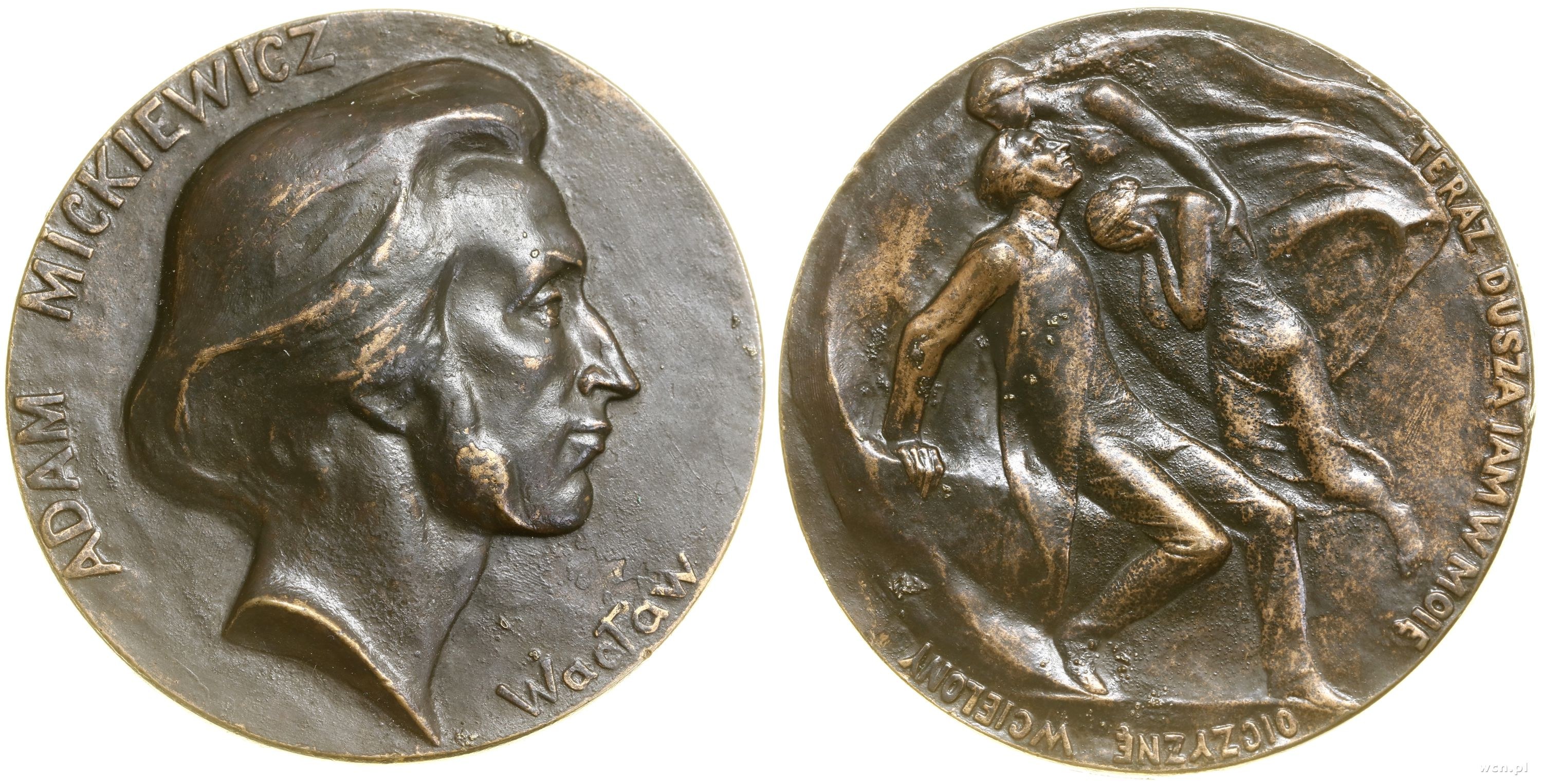Aw: Głowa poety w prawo, wokoło ADAM MICKIEWICZ / Wacław, Rw: Scena symboliczna z rzeźby Szymanowskiego (znajdującej się w Muzeum Narodowym w Krakowie), ilustrująca obudzenie się wieszcza z omdlenia po napisaniu Wielkiej Improwizacji, TERAZ DUSZĄ IAM W MOIĘ OICZYZNĘ WCIELONY, Obrzeże: Punca BRONZE, projektował Wacław Szymanowski, stemple rytował Paulin Ernest Tasset