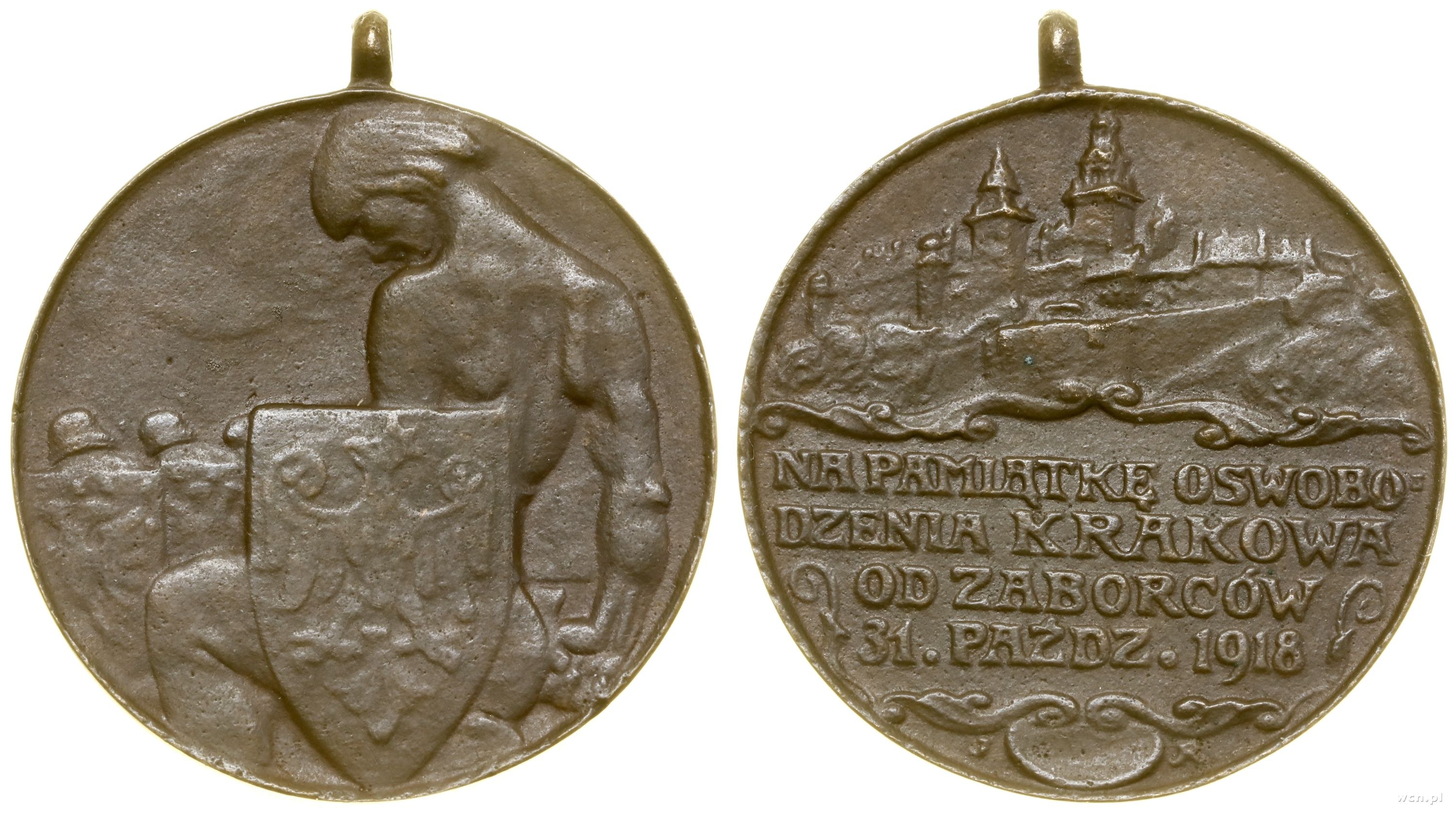 Aw: Półnagi wojownik z tarczą z orłem, w tle uciekający żołnierze z tarczami z dwugłowymi orłami; Rw: Widok Wawelu, niżej NA PAMIĄTKĘ OSWOBO= / DZENIA KRAKOWA / OD ZABORCÓW / 31. PAŹDZ. 1918, projektował Jan Raszka