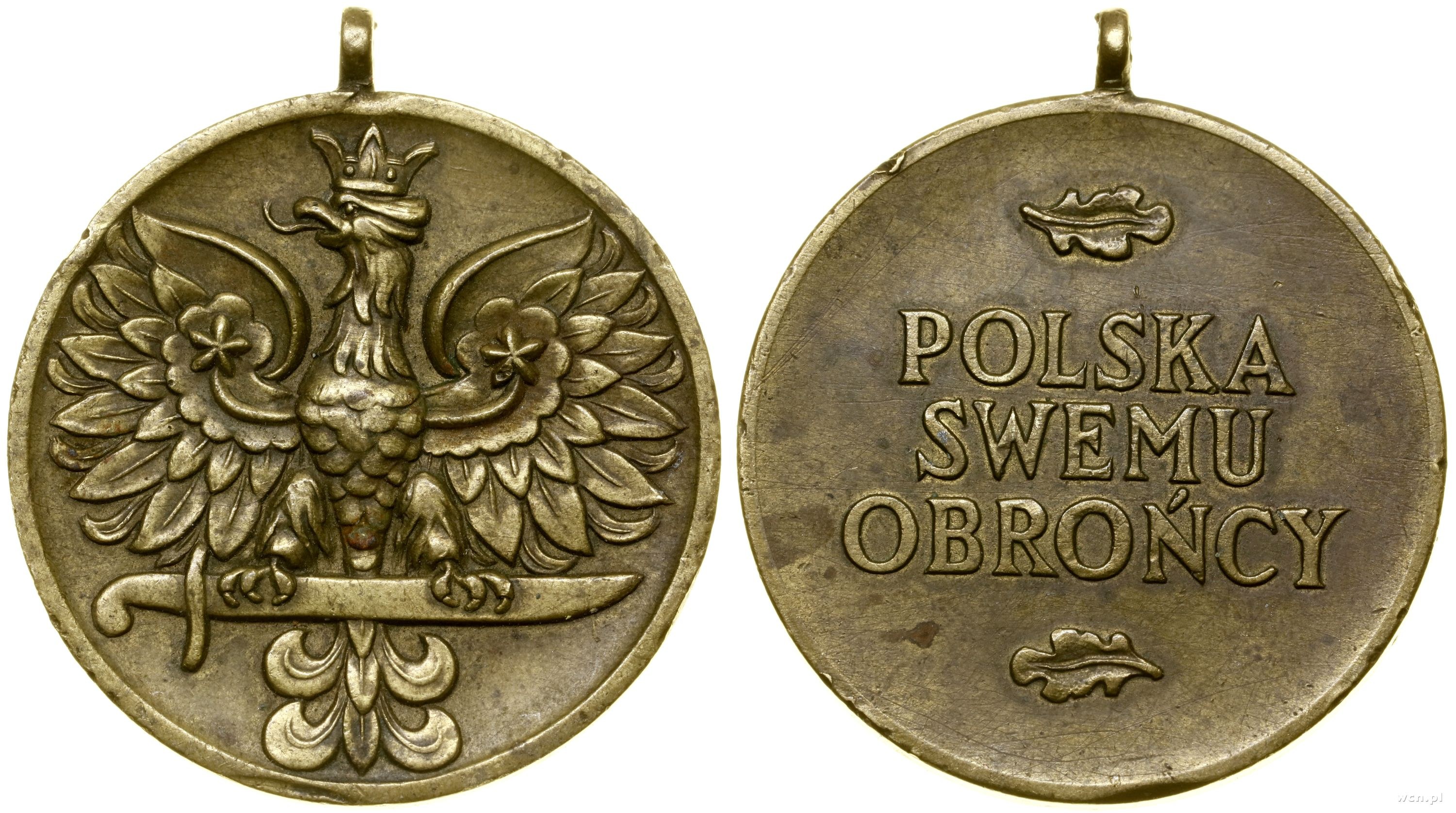 Orzeł stojący na tasaku, na stronie odwrotnej dwa liście dębu między którymi POLSKA / SWEMU / OBROŃCY, odznaczenie jednoczęściowe, mocowane na wstążkę, brak wstążki
