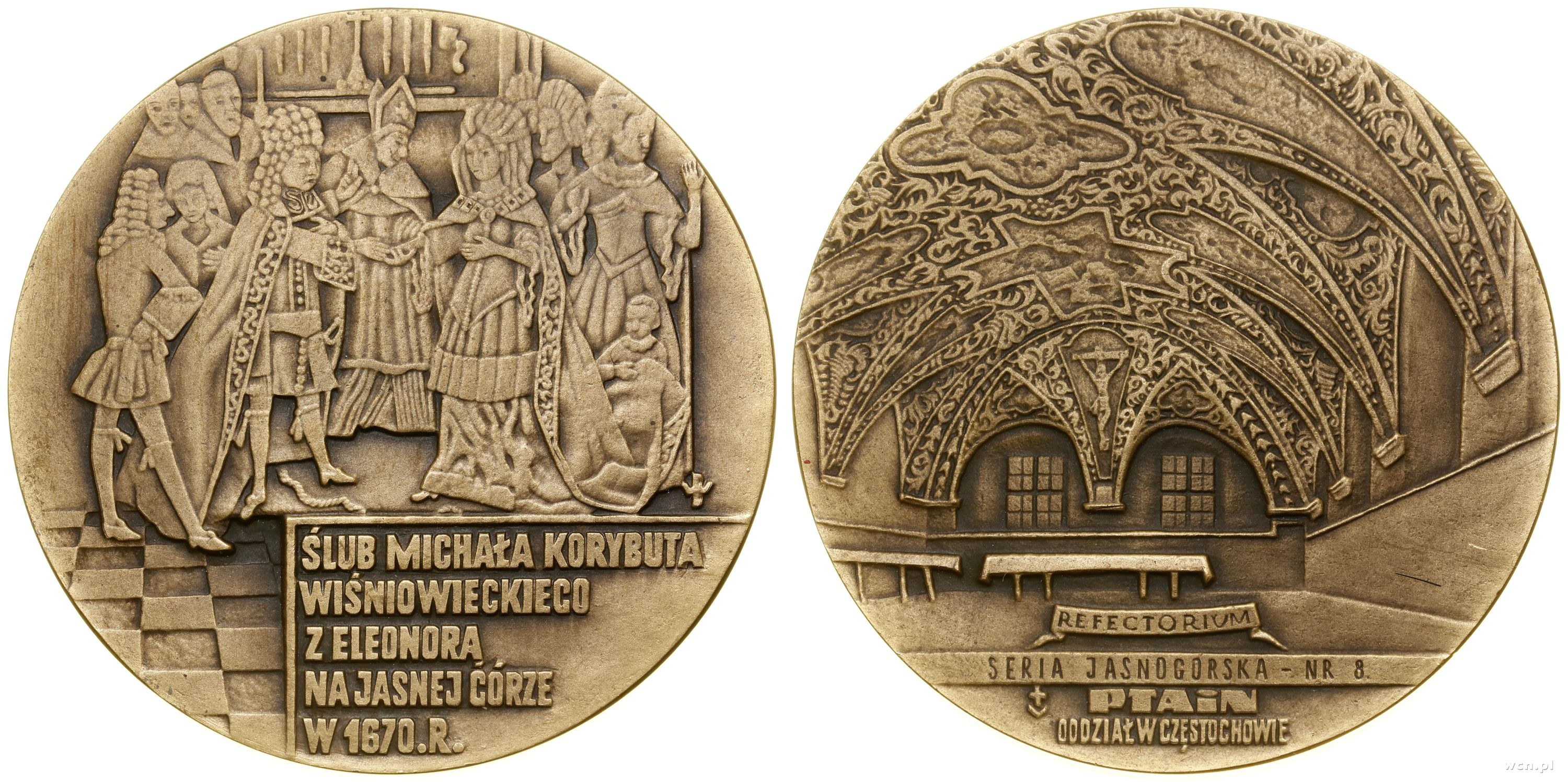 Aw: Scena ślubu, ŚLUB MICHAŁA KORYBUTA / WIŚNIOWIECKIEG / Z ELEONORĄ / NA KASNEJ GÓRZE / W 1670.R., Rw: Widok refektarza klasztoru jasnogórskiego, na dole szarfa, na której REFECTORIUM, w odcinku SERIA JASNOGÓRSKA NR 8 / PTAiN / ODDZIAŁ W CZĘSTOCHOWIE, projektował Wojciech Barylski, medal wybity w Zjednoczonych Zakładach Gospodarczych Veritas w Częstochowie