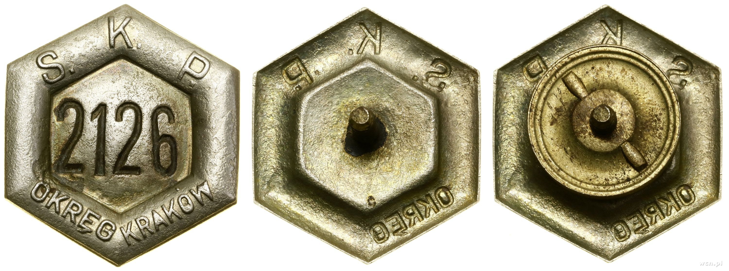 Sześciokąt, wewnątrz nabite 2126, wokół S. K. P. - OKRĘG KRAKÓW, odznaka jednoczęściowa, bita z kontrą, mocowana na słupek, nakrętka niesygnowana