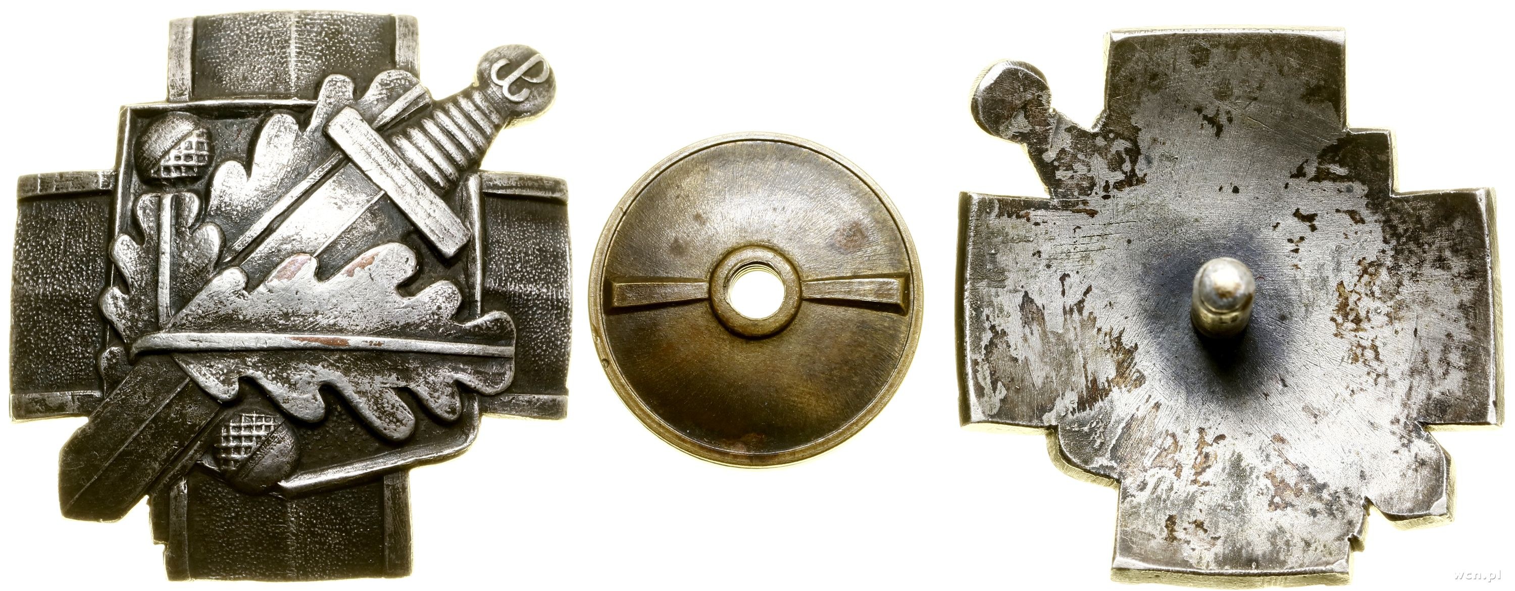 Krzyż, na środku tarcza, przez którą przechodzi miecz opleciony dałązkami dębowymi, na głowicy miecza litery PW, odznaka jednoczęściowa, mocowana na słupek, nakrętka niesygnowana