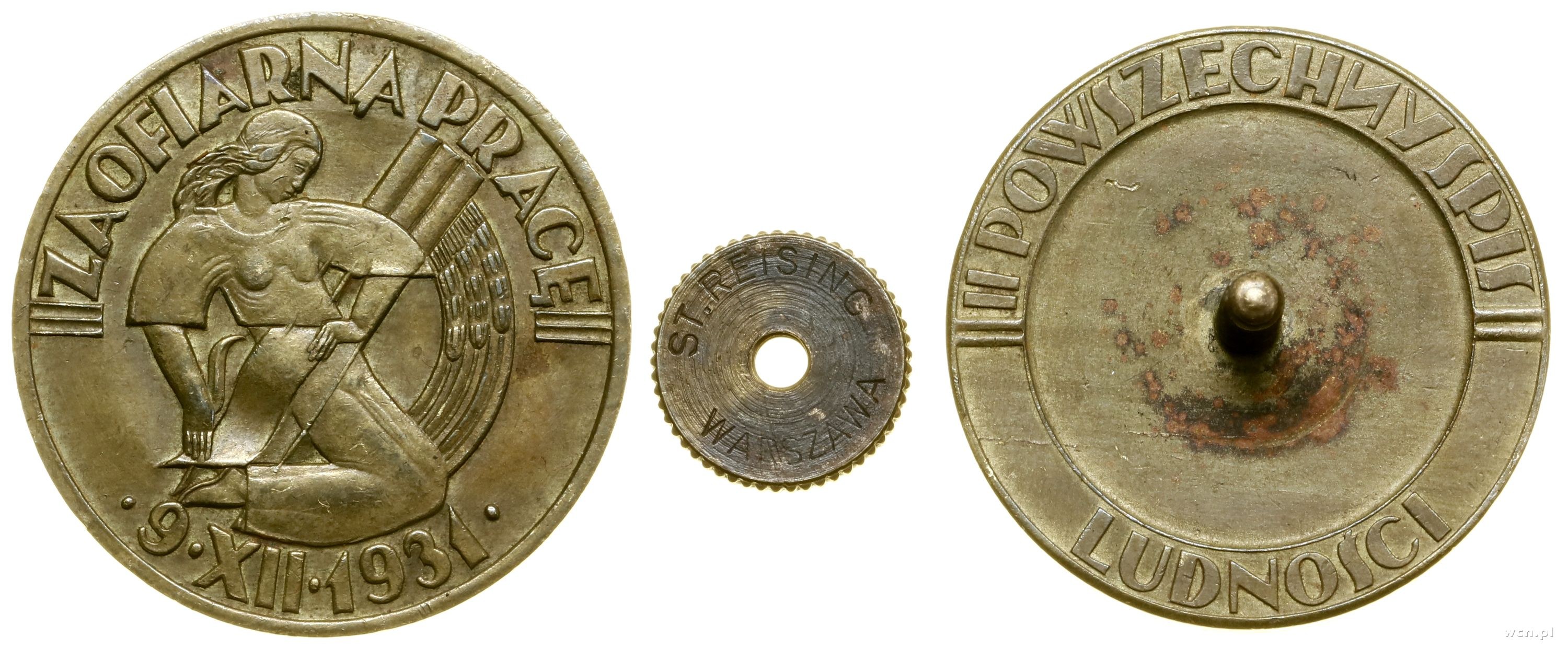 Żniwiarka pochylona nad snopkiem, w otoku ZA OFIARNĄ PRACĘ 9 XII 1931, na stronie odwrotnej punce srebra, w otoku II POWSZECHNY SPIS LUDNOŚCI, odznaka jednoczęściowa, mocowana na nakrętkę, nakrętka sygnowana ST. REISING - WARSZAWA