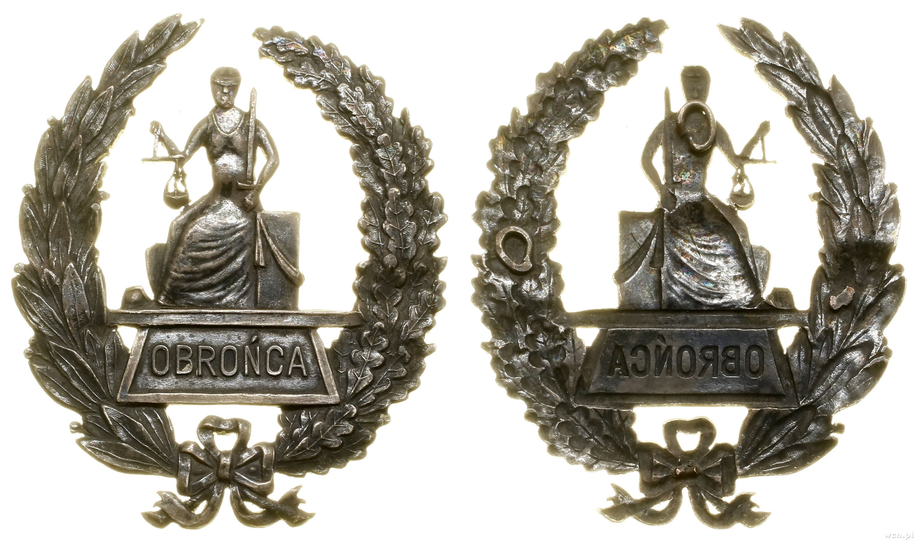 Wineic, w którym Temida z wagą i mieczem, niżej plakieta z napisem OBROŃCA, oznaka jednoczęśćiowa, bita z kontrą, mocowana na cztery oczka, dwa wyłamane