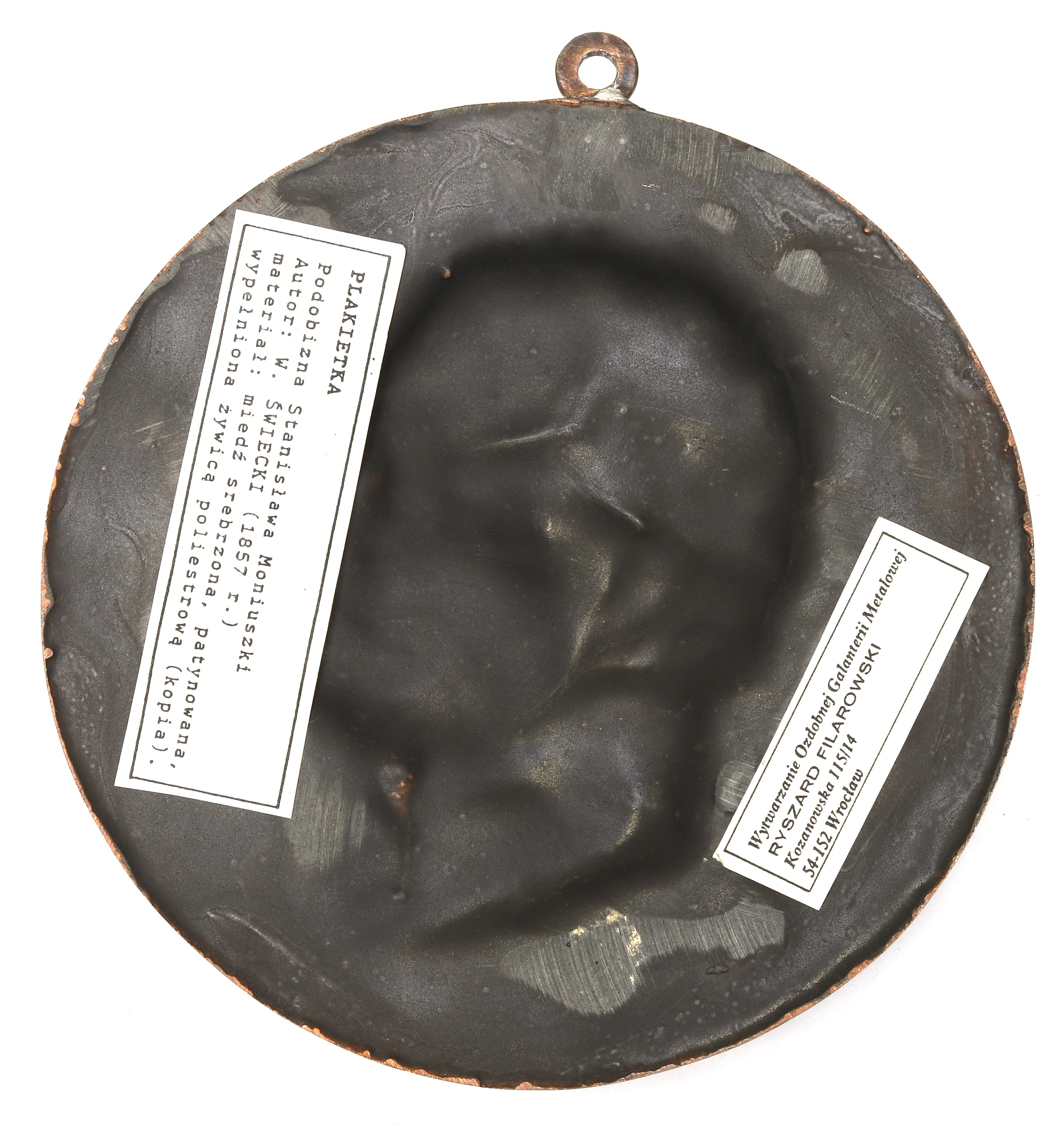 Miedź srebrzona, patynowana, wypełniona żywicą poliestrową, średnica 12,6 cm.