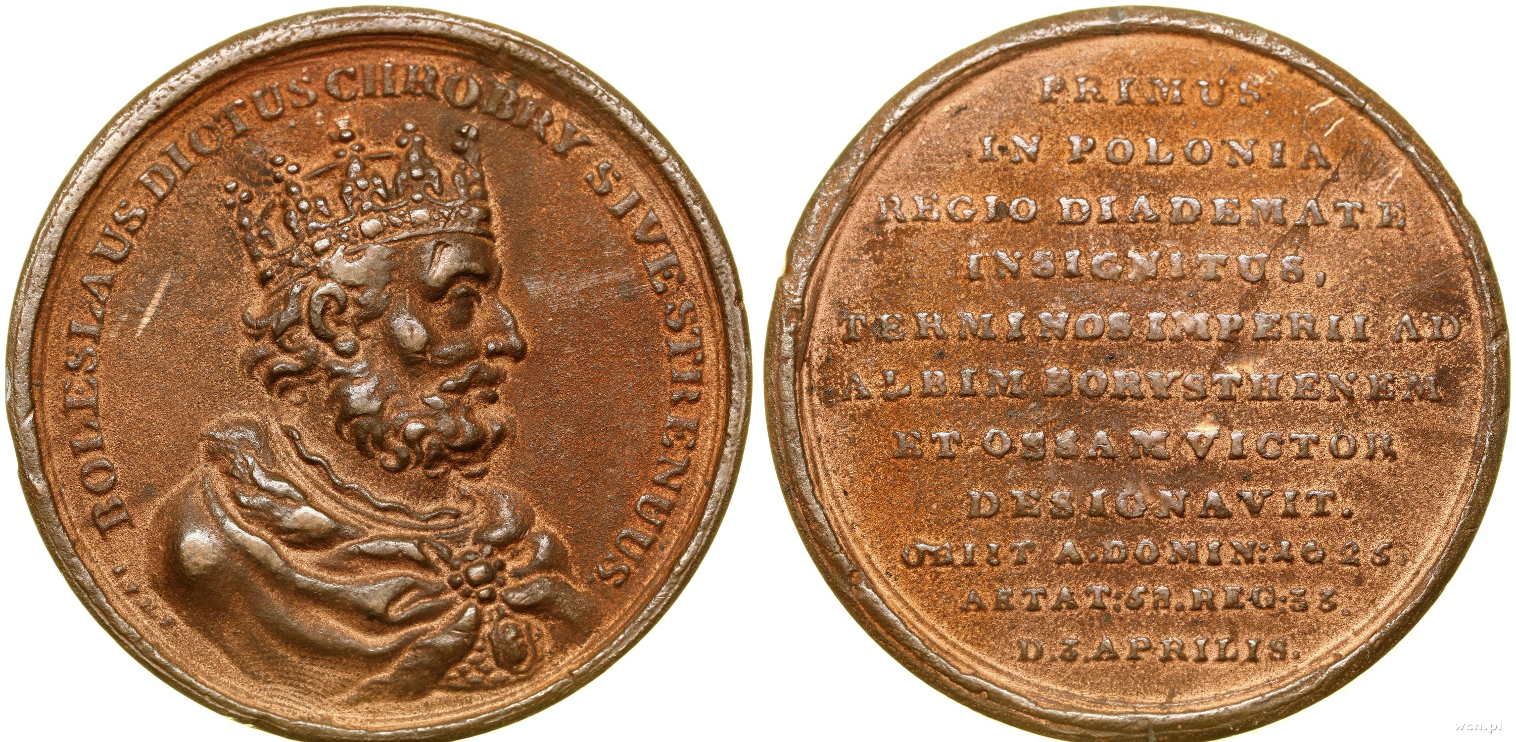 Aw: Popiersie władcy w koronie, w prawo, BOLESLAUS DICTUS CHROBRY SIVE STRENUUS, Rw: PRIMUS / IN POLONIA / REGIO DIADEMATE / INSIGNITUS. / TERMINOS IMPERII AD / ALBIM BORYSTHENEM / ET OSSAM VICTOR / DESIGNAVIT. / OBIIT A. DOMINO: 1025. / AETAT: 58. REG: 33. / D. 3 APRILIS
