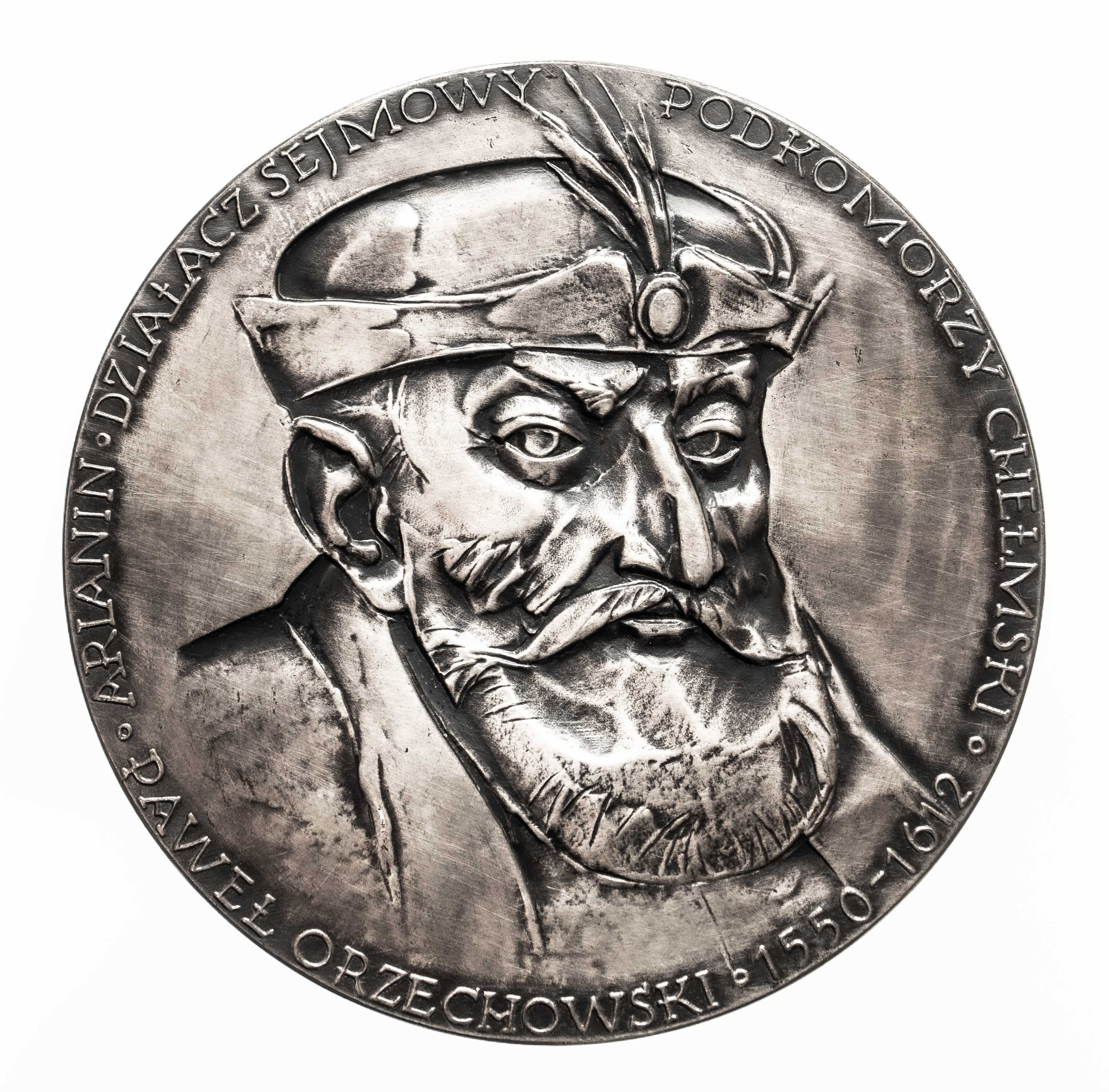 Podkomorzy chełmski Paweł Orzechowski. Awers: Głowa, legenda w otoku. Rewers: zamek w Krupem koło Krasnegostawu. Tombak srebrzony i oksydowany, 70 mm.