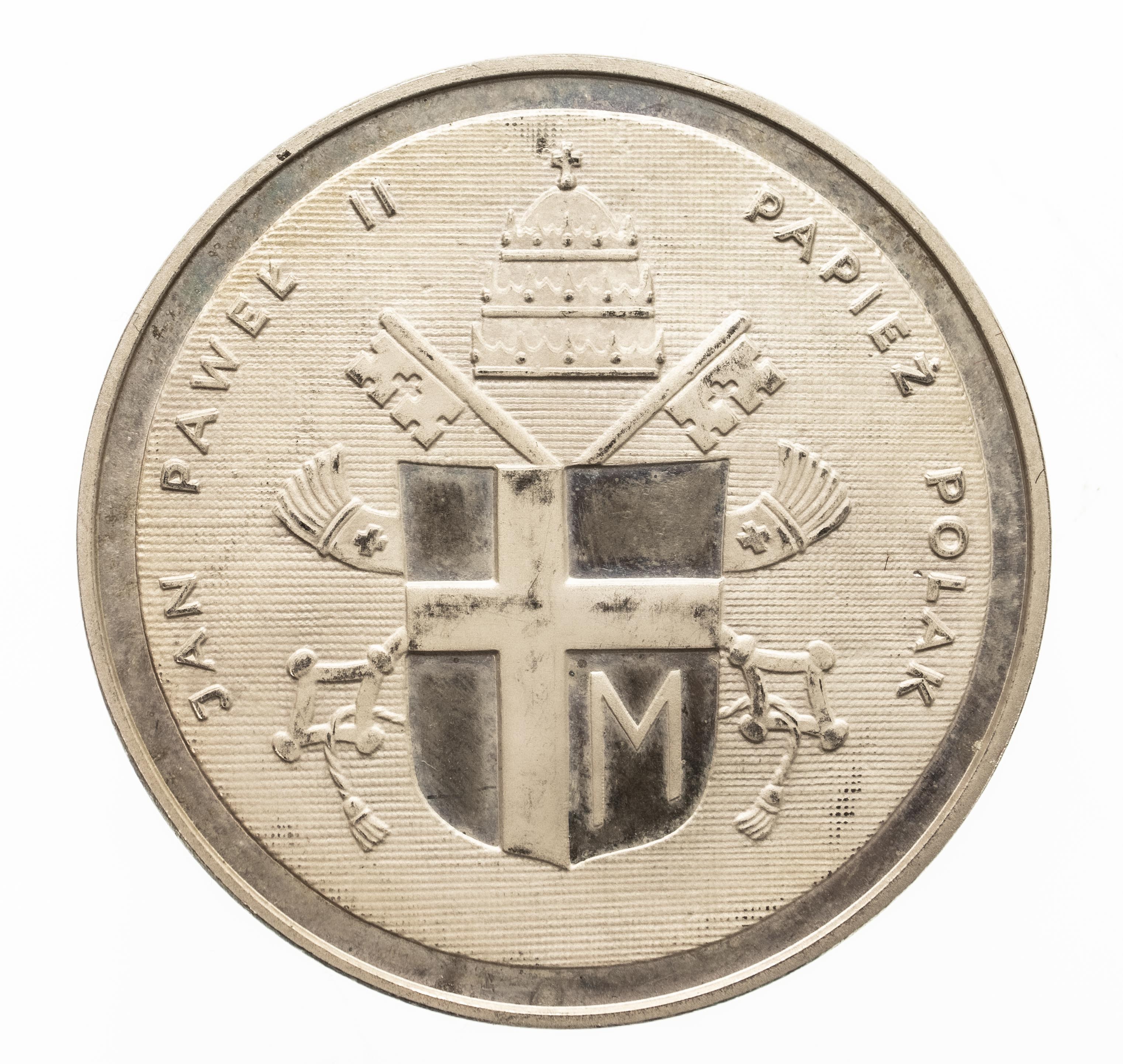 Srebrny medal z Papieżem Janem Pawłem II projektu Ewy Olszewskiej-Borys, stempel lustrzany, na rancie próba Ag 925.