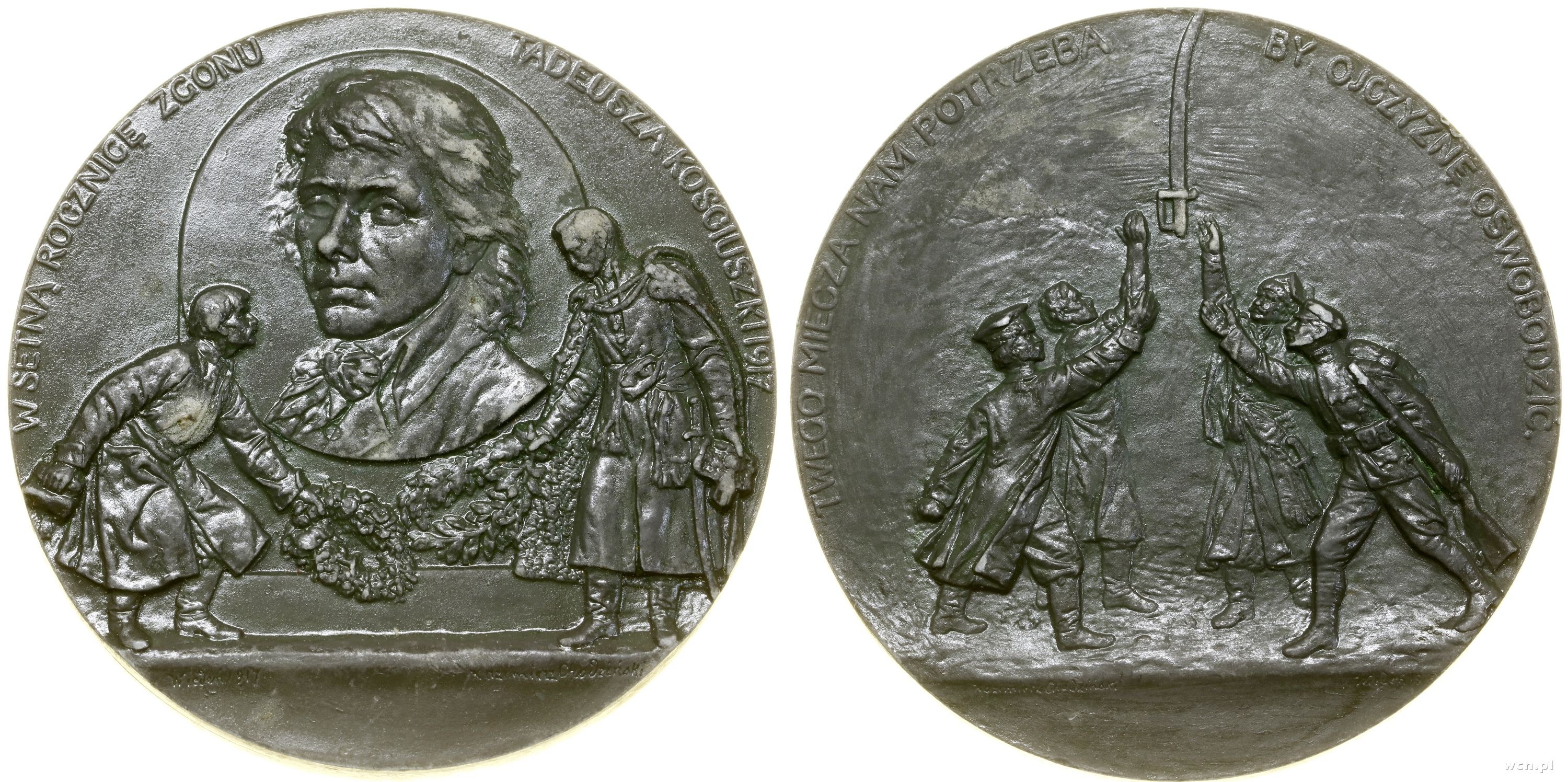 Aw: Dwie postacie składające wieniec przy medalionie z popiersiem Tadeusza Kościuszki, niżej WIEDEŃ 1917 - Kazimierz Chudziński, W SETNĄ ROCZNICĘ ZGONU - TADEUSZA KOŚCIUSZKI, Rw: Cztery postacie wyciągające ręce do szabli, w tle kopiec Kościuszki i pomnik Kościuszki w Chicago, TWEGO MIECZA NAM POTRZEBA - BY OJCZYZNĘ OSWOBODZIĆ., projektował Kazimierz Chodziński