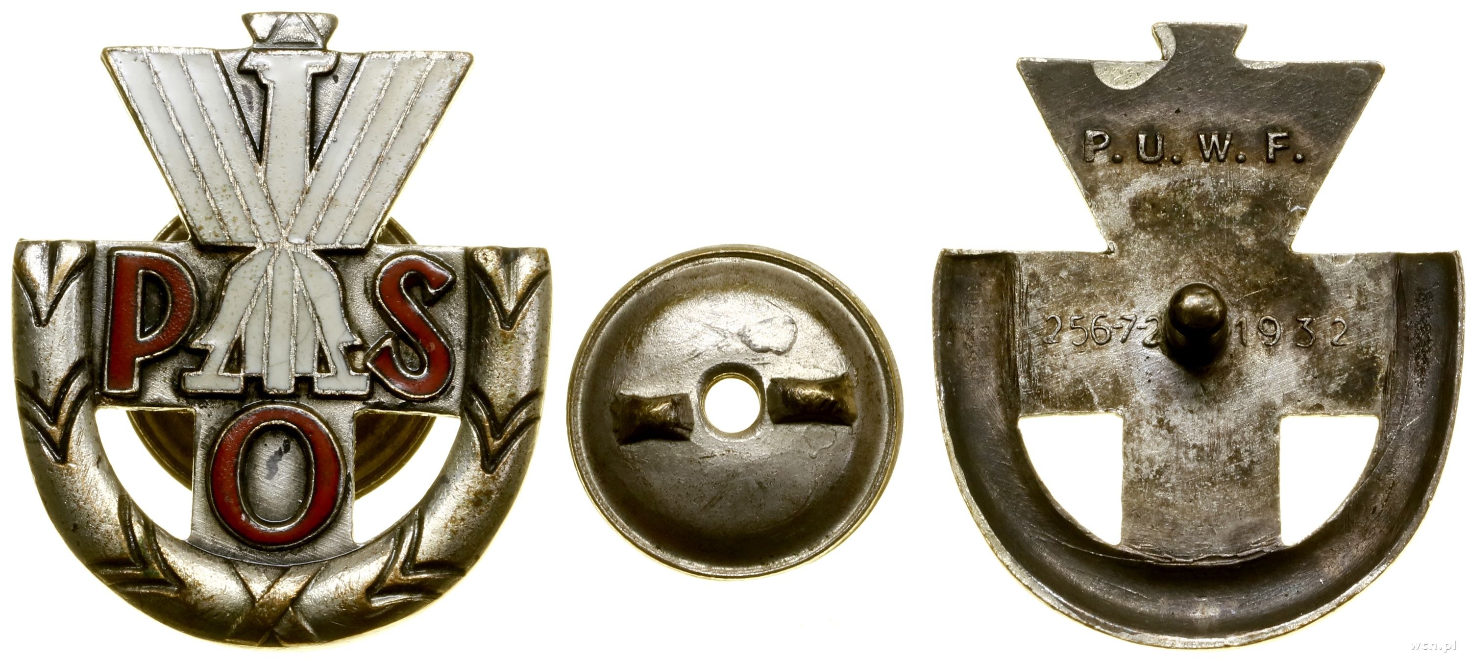 Stylizowany Orzeł, przy jego łapach litery P-O-S, wokół których srebrny wieniec, na stronie odwrotnej P.U.W.F. / 256-7-2 - 1932, odznaka jednczęściowa, mocowana na słupek, nakrętka niesygnowana