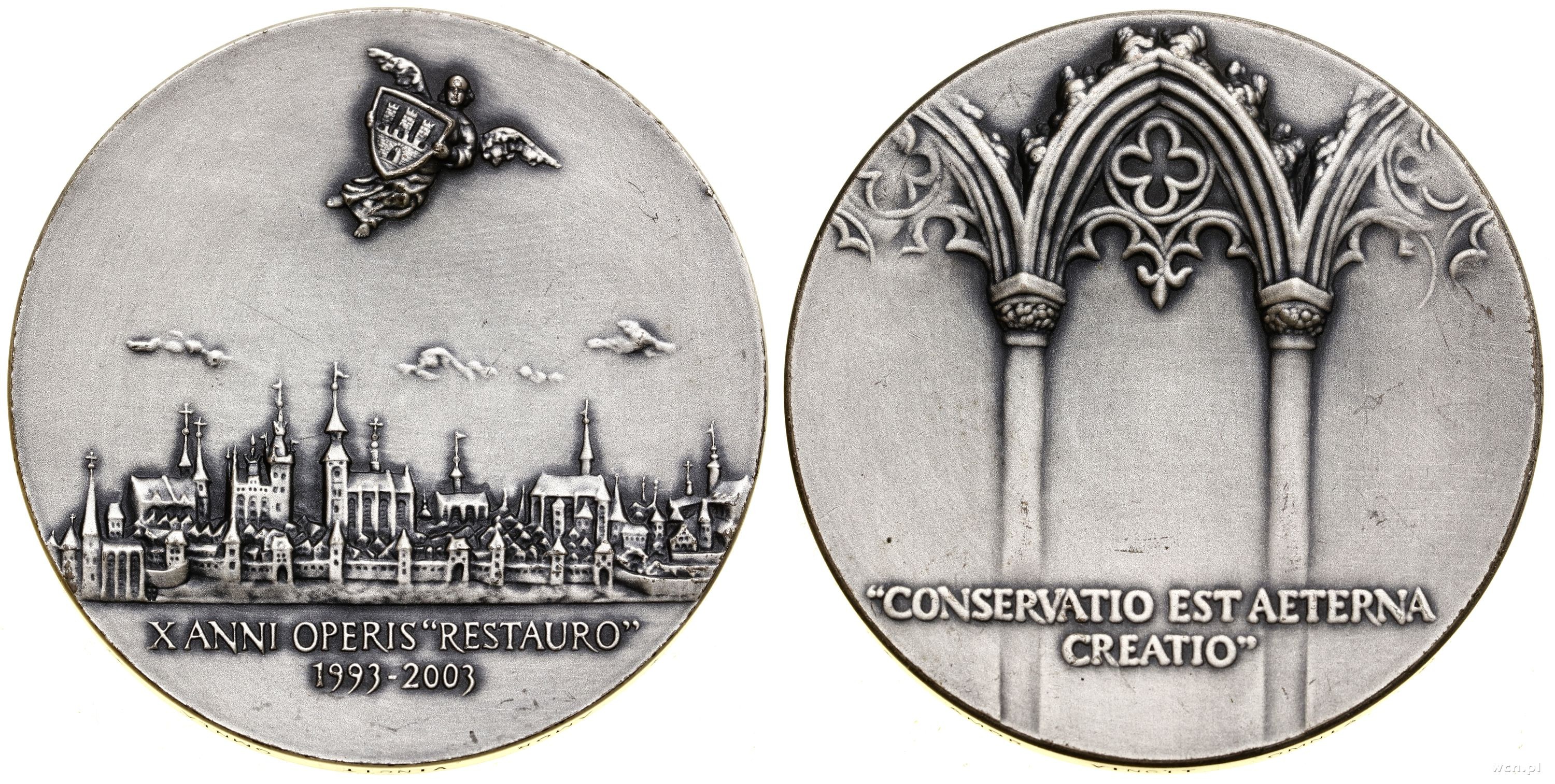 Aw: Panorama Torunia, wyżej anioł z herbem miasta, na dole X ANNI OPERIS "RESTAURO" / 1993 • 2003, Rw: Dwa filary wspierające łuki, "CONSERVATIO EST AETERNA / CREATIO", Obrzeże: AMOR VINCIT OMNIA - MALGORZATA ET SLAVOMIR XX ANNO CONIUNCTI