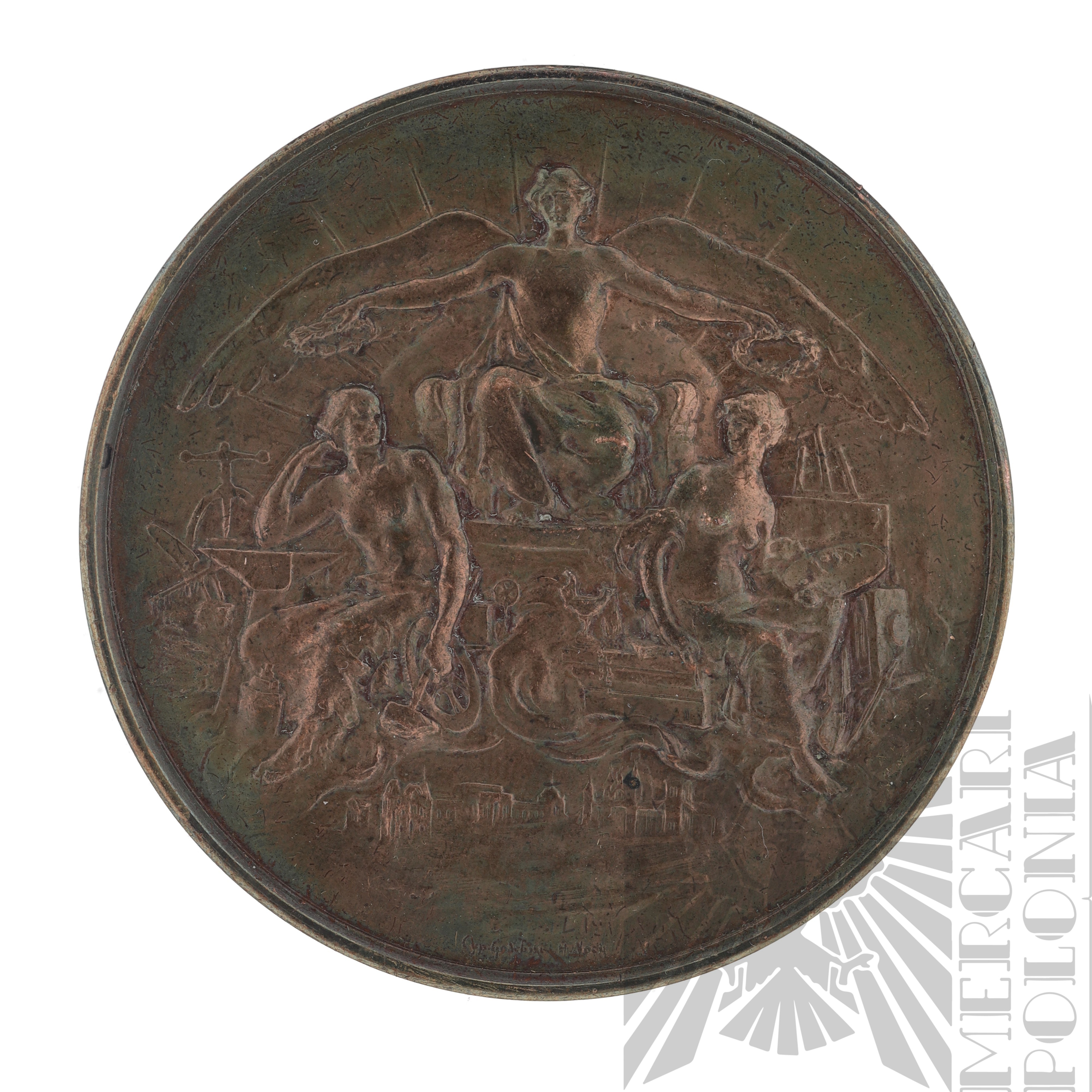 Na awersie po lewej gałązka palmowa, po prawej napis w trzech wierszach „POWSZECHNA WYSTAWA / KRAJOWA / 1894”. Na awersie na tle promieni słonecznych siedząca na tronie uskrzydlona, półnaga kobieta z wieńcami laurowymi w obu rękach, po lewej u stóp postumentu personifikacja Przemysłu i Rolnictwa z kołem i młotem, oparta o kowadło, obok prasa, grabie, ostrze kosy i snop zboża; po prawej personifikacja Sztuki z paletą w ręku, przy niej sztaluga, aparat fotograficzny, pędzle, kielich i biżuteria; w dolnej części panorama Lwowa, u dołu sygnatura „Cyp: Godebski – H. Nocq”