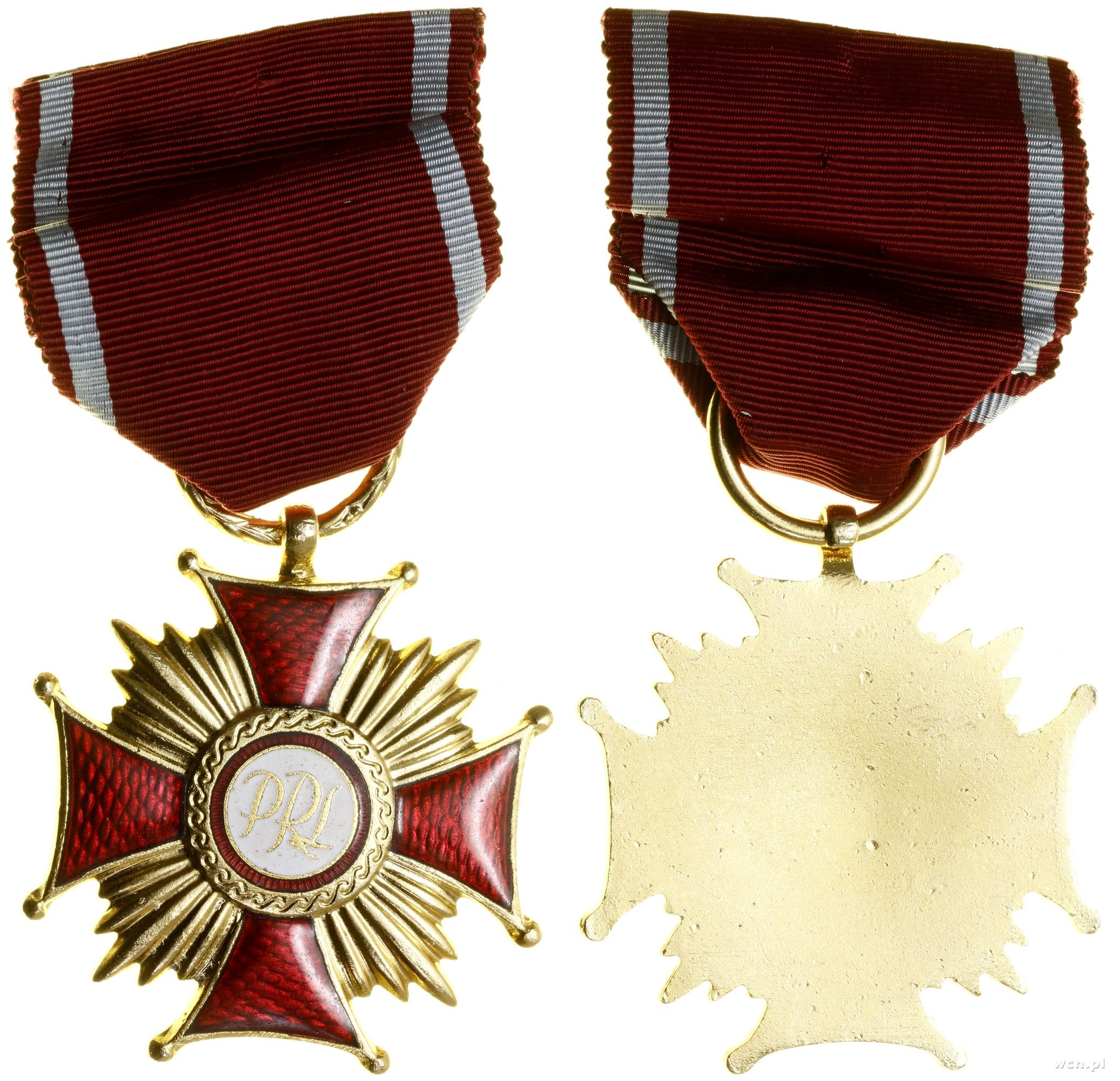 Krzyż kawalerski, z rogami ramion zakończonymi kulkami, w każdym kącie po pięć promieni, w medalionie w obwódce litery PRL