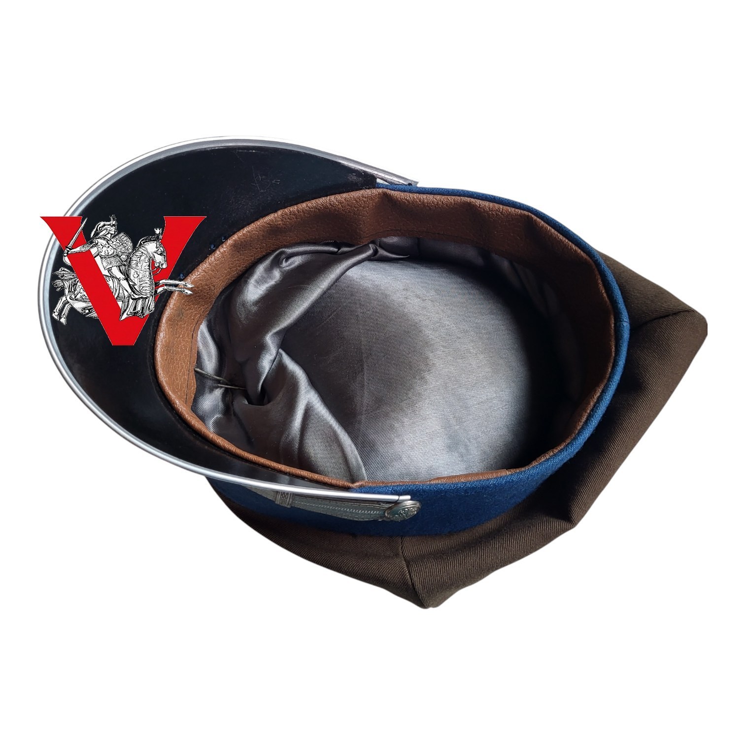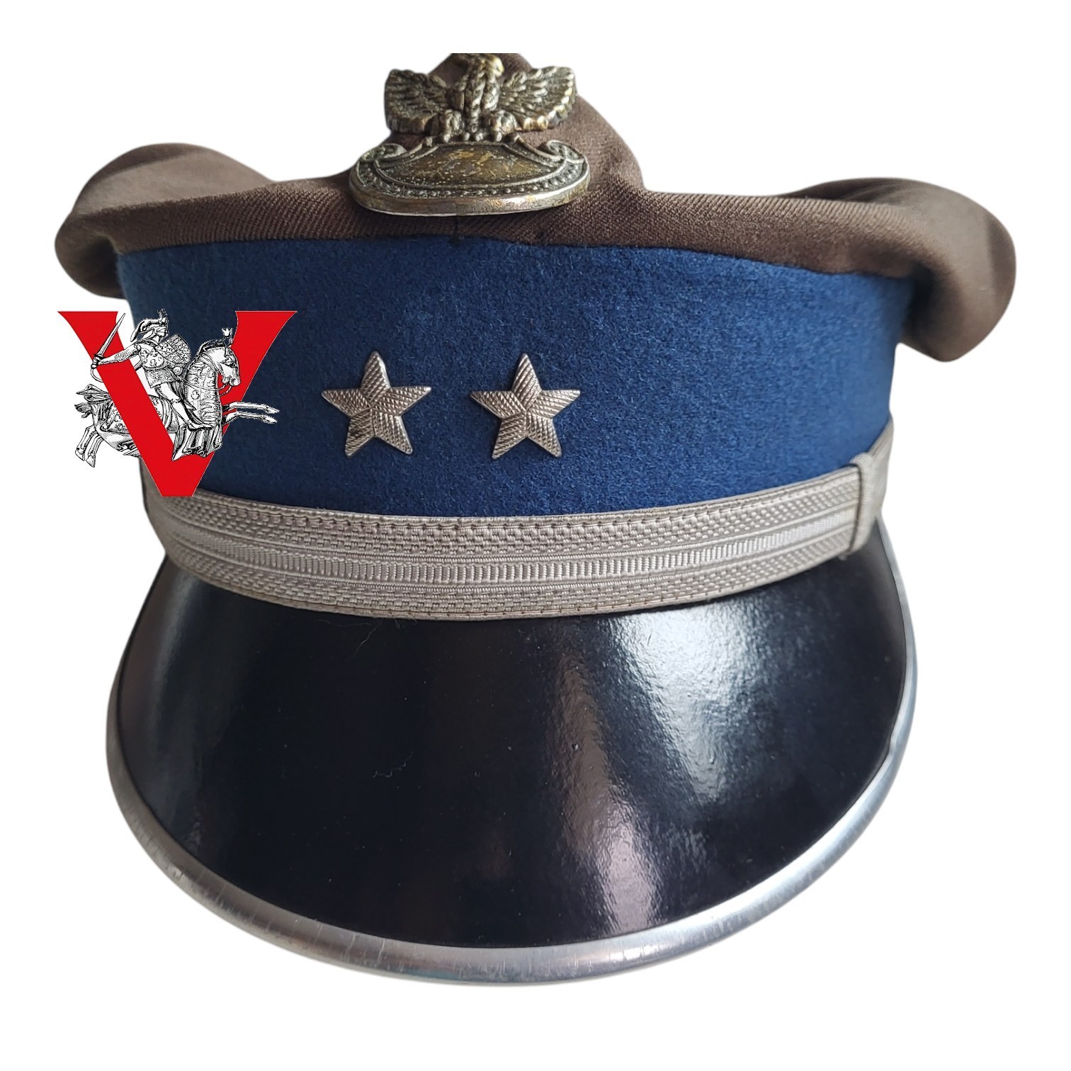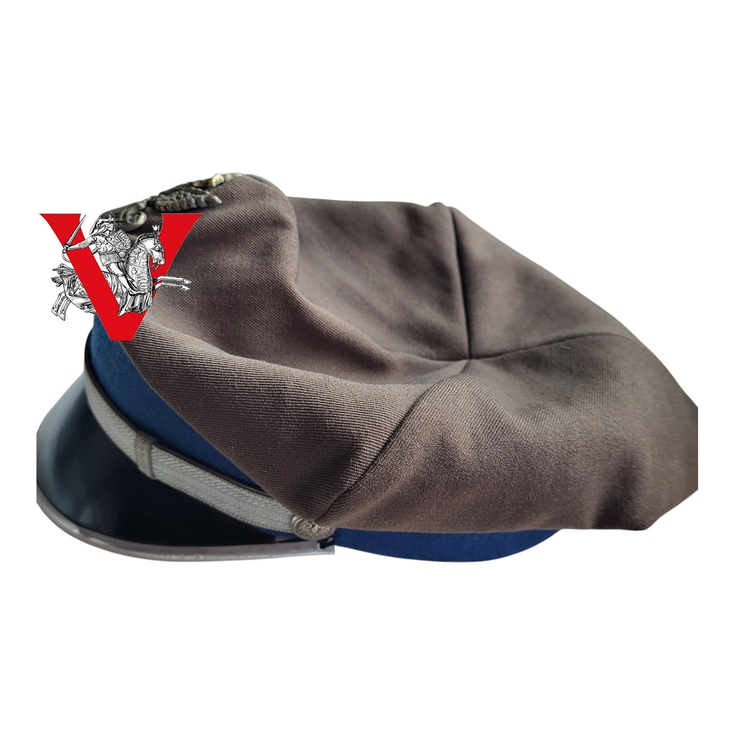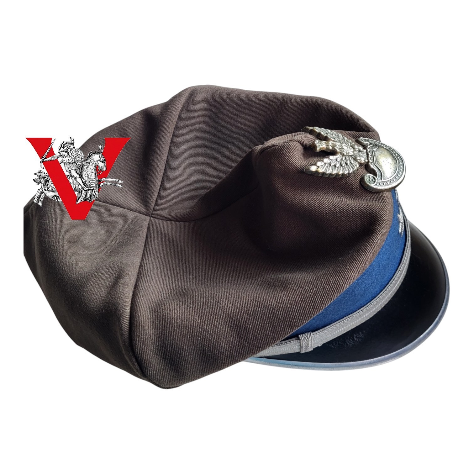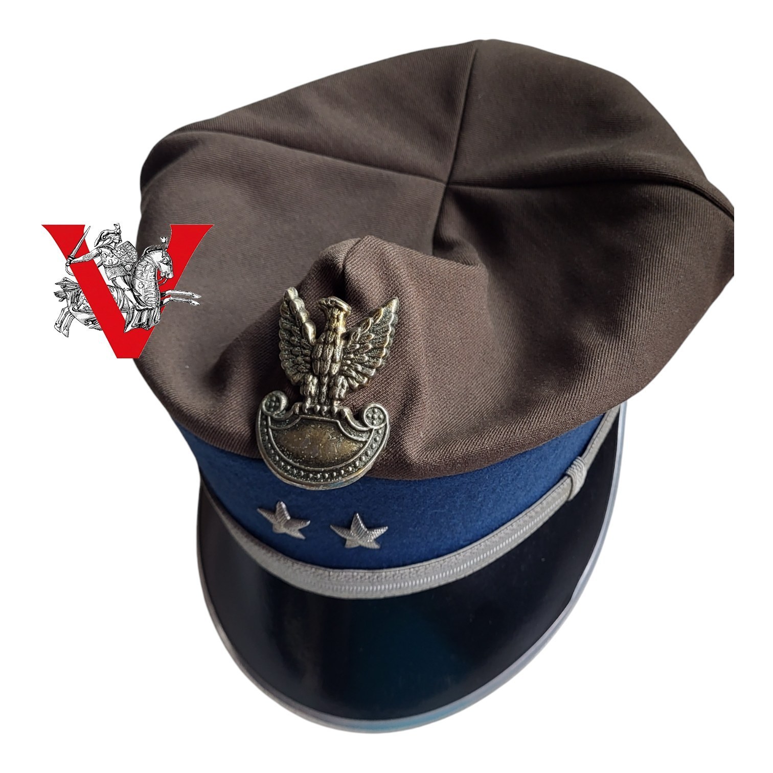 Oryginalna rogatywka weterana Powstań Śląskich, wzorowana na czapkach wojskowych II RP. Charakterystyczny niebieski otok i brązowy korpus z dwoma gwiazdkami oficerskimi wskazują na model noszony przez byłych powstańców w okresie międzywojennym oraz powojennym, podczas uroczystości patriotycznych i kombatanckich.
