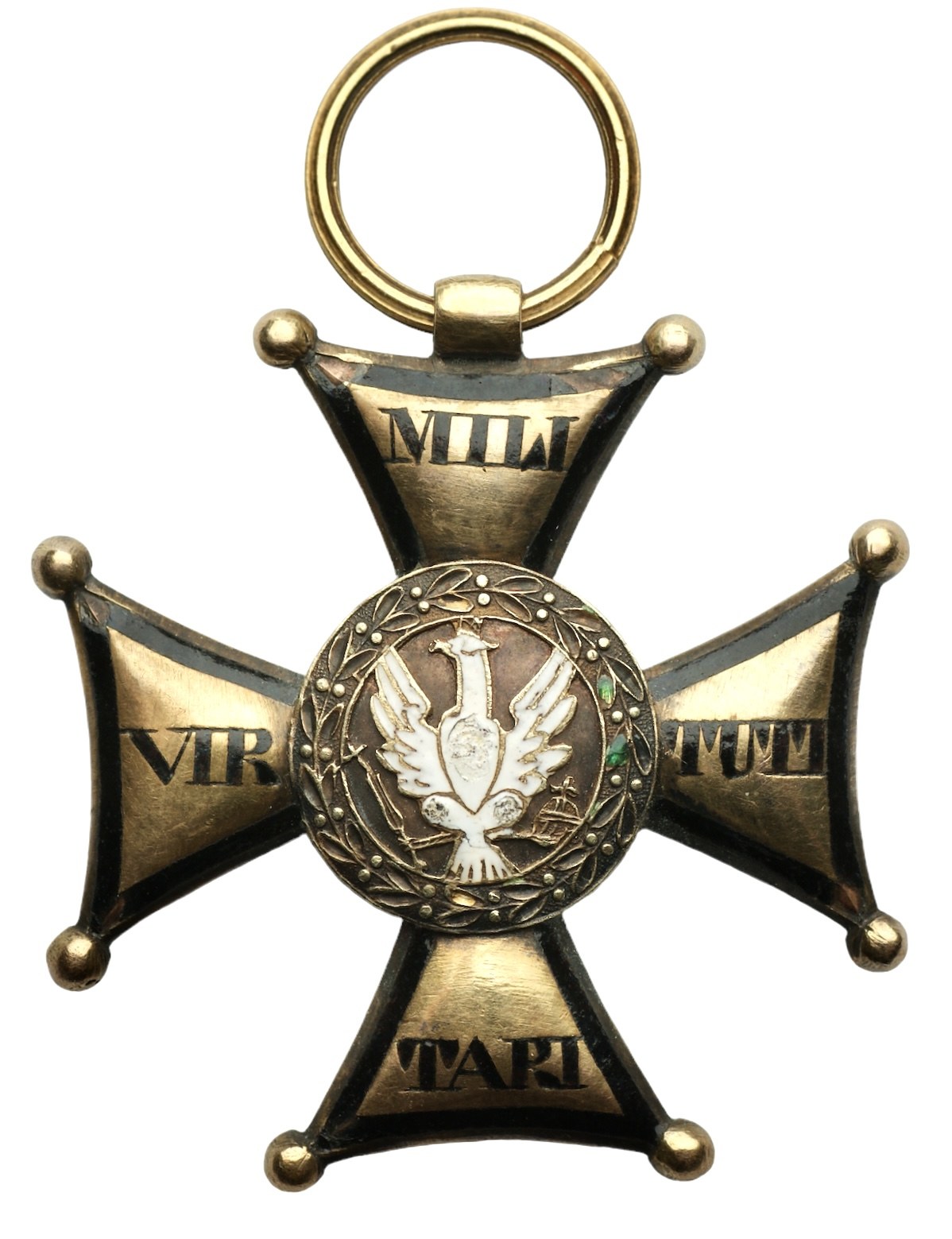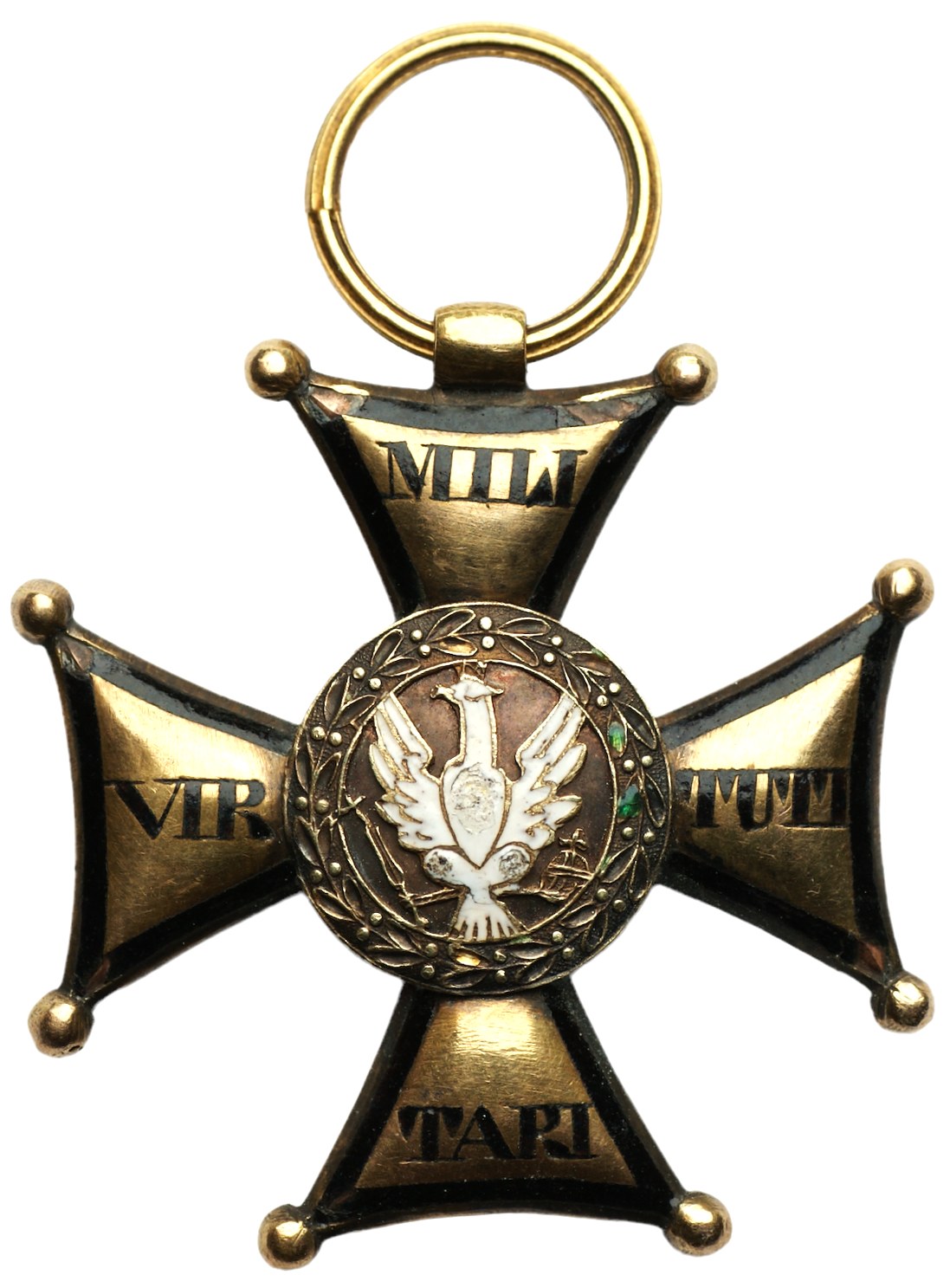 Na ramionach krzyża VIR-TUTI MILI / TARI, ramiona w czarnej emaliowanej obwódce, na środku krzyża obręcz z liści wawrzynu, wewnątrz której emaliowany na biało Orzeł trzymający berło oraz jabłko panowania.