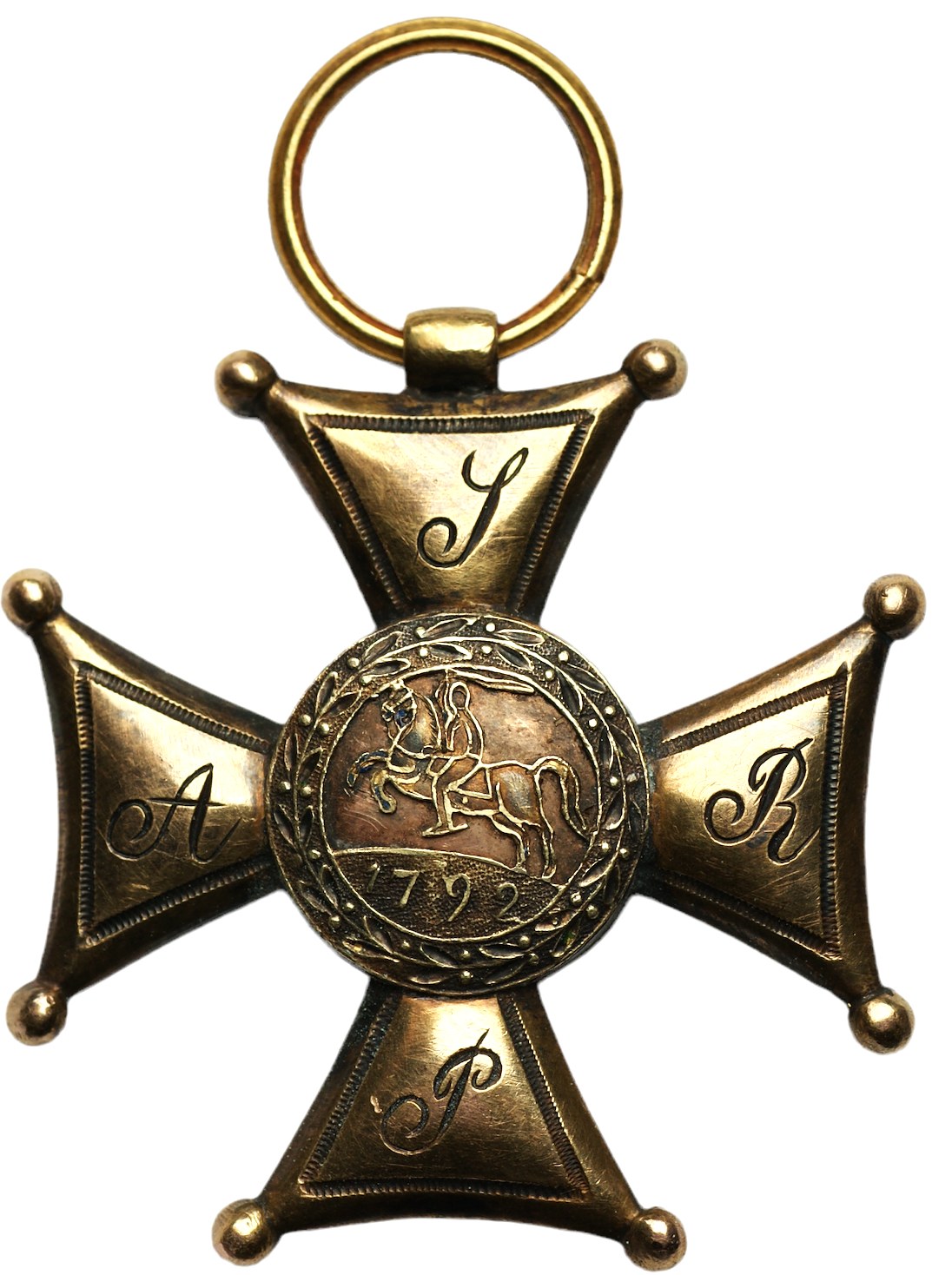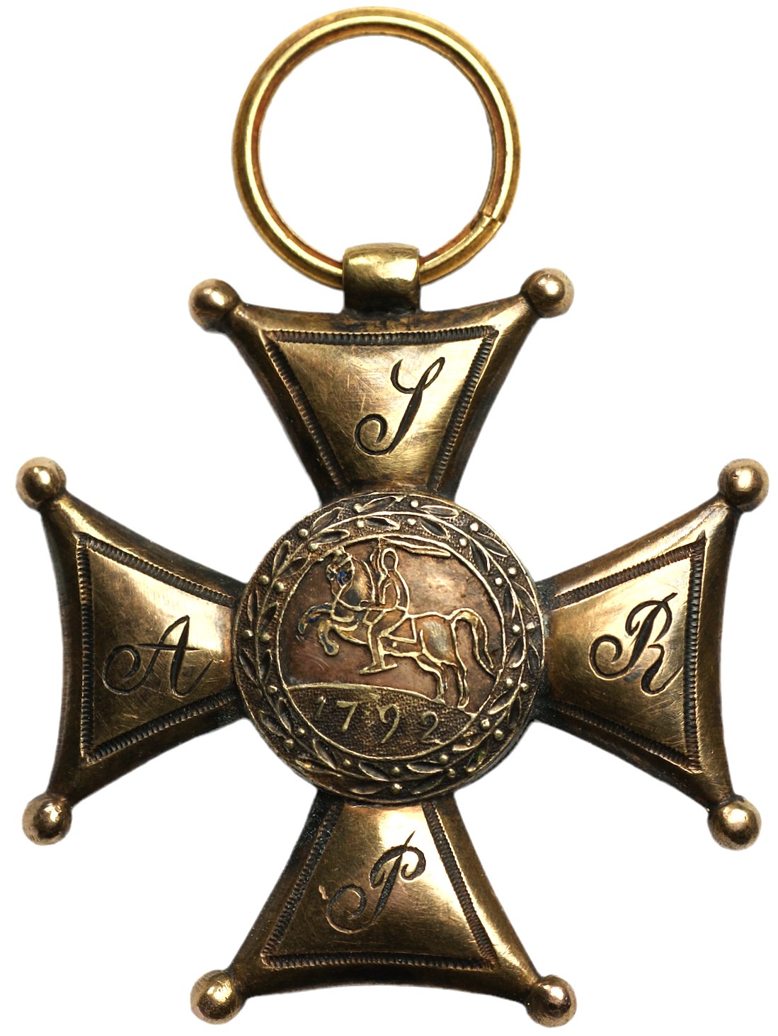 Na stronie odwrotnej na ramionach krzyża litery S / A-R / P w grawerowanej obwódce, na środku krzyża obręcz z liści wawrzynu, wewnątrz Pogoń, niżej data 1792
