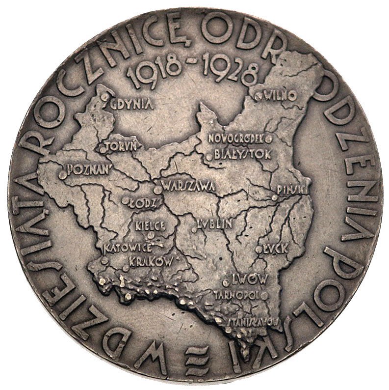 POLSKA, Powszechna Wystawa Krajowa w Poznaniu 1929 r.- medal autorstwa S. R. Koźbielewskiego, Aw: Kompozycja z symboli przemysłu i rolnictwa, na górze Orzeł państwowy i napis, Rw: Mapa Polski i napis w otoku W DZIE- SIĄTĄ ROCZNICĘ ODRODZENIA POLSKI 1918-1928, Strzałk. 630, srebro 54 mm
