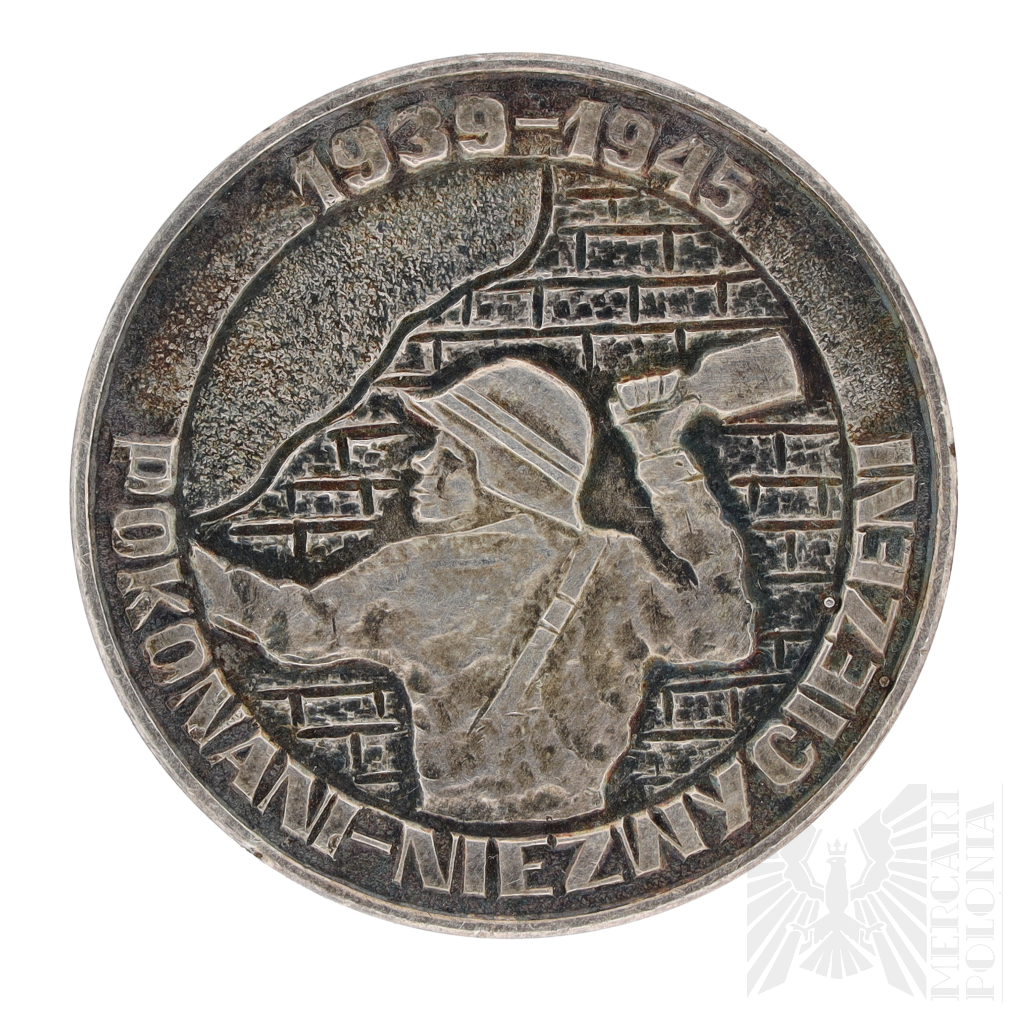 Polska, medal pamiątkowy. Awers: Powstańcza kotwica na murze, obok inicjały AK, napis „ZA HONOR I OJCZYZNĘ – 1.VIII.1944”. Rewers: Powstaniec rzucający granat na tle muru, lata 1939–1945, napis „POKONANI–NIEZWYCIĘŻENI”.