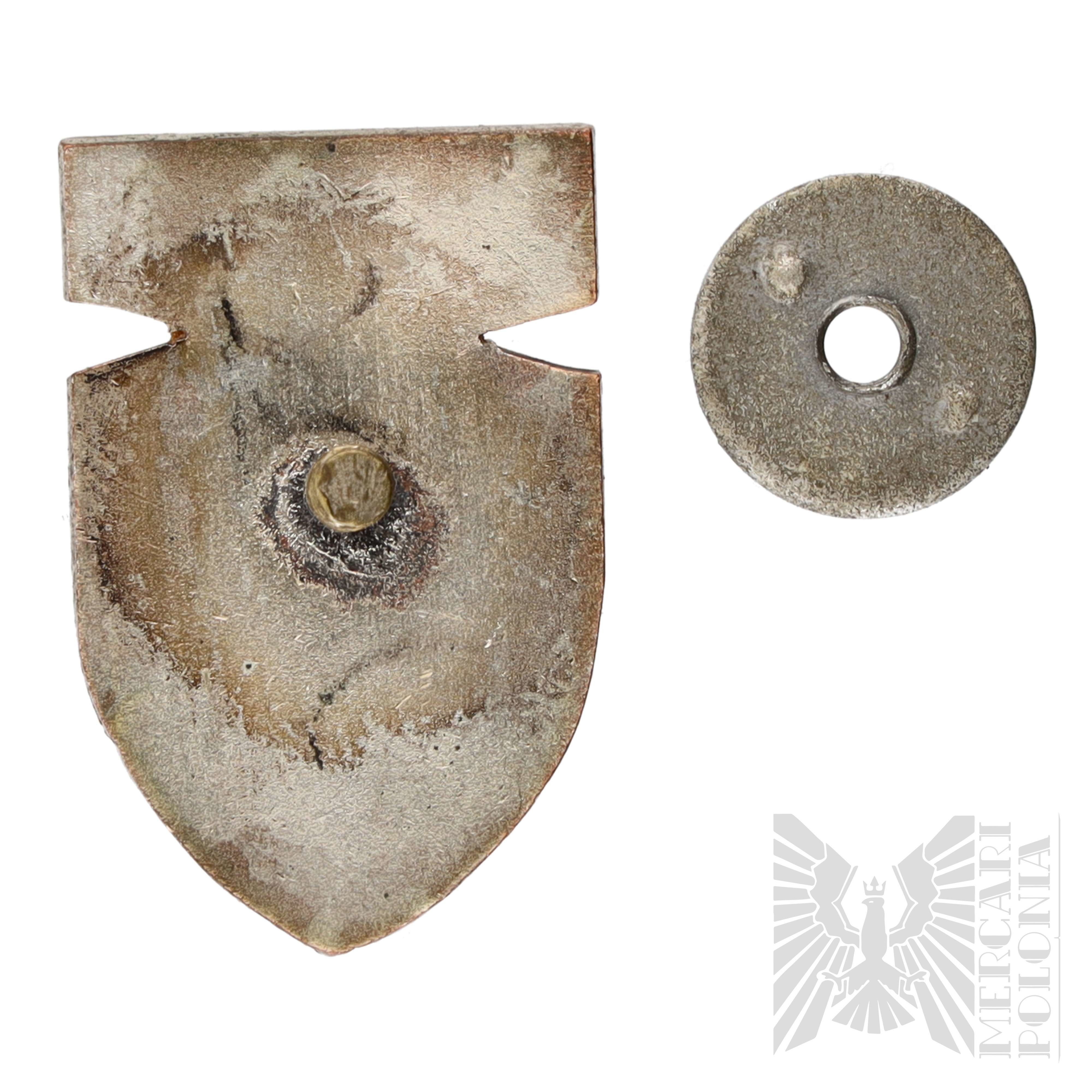Rewers gładki srebrzony z widocznym słupkiem mocującym i nakrętką.