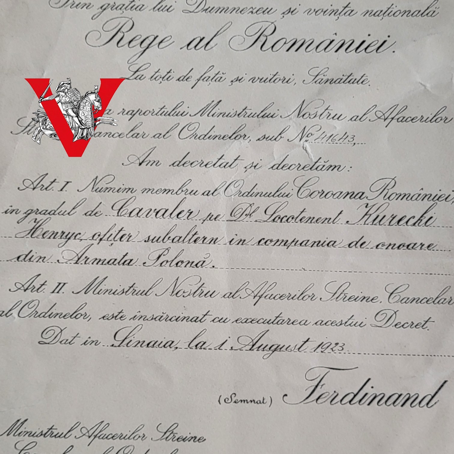 Oryginalny dyplom nadania Krzyża Kawalerskiego Orderu Korony Rumunii, wystawiony w 1923 roku w Jassach i podpisany przez króla Ferdynanda I. Odznaczenie przyznane polskiemu oficerowi 20 Pułku Piechoty Ziemi Krakowskiej, co potwierdza dołączony dokument z 1924 roku prostujący pomyłkę w nazwisku – oficjalne pismo z dowództwa pułku, z oryginalną pieczęcią i podpisem kapitana.