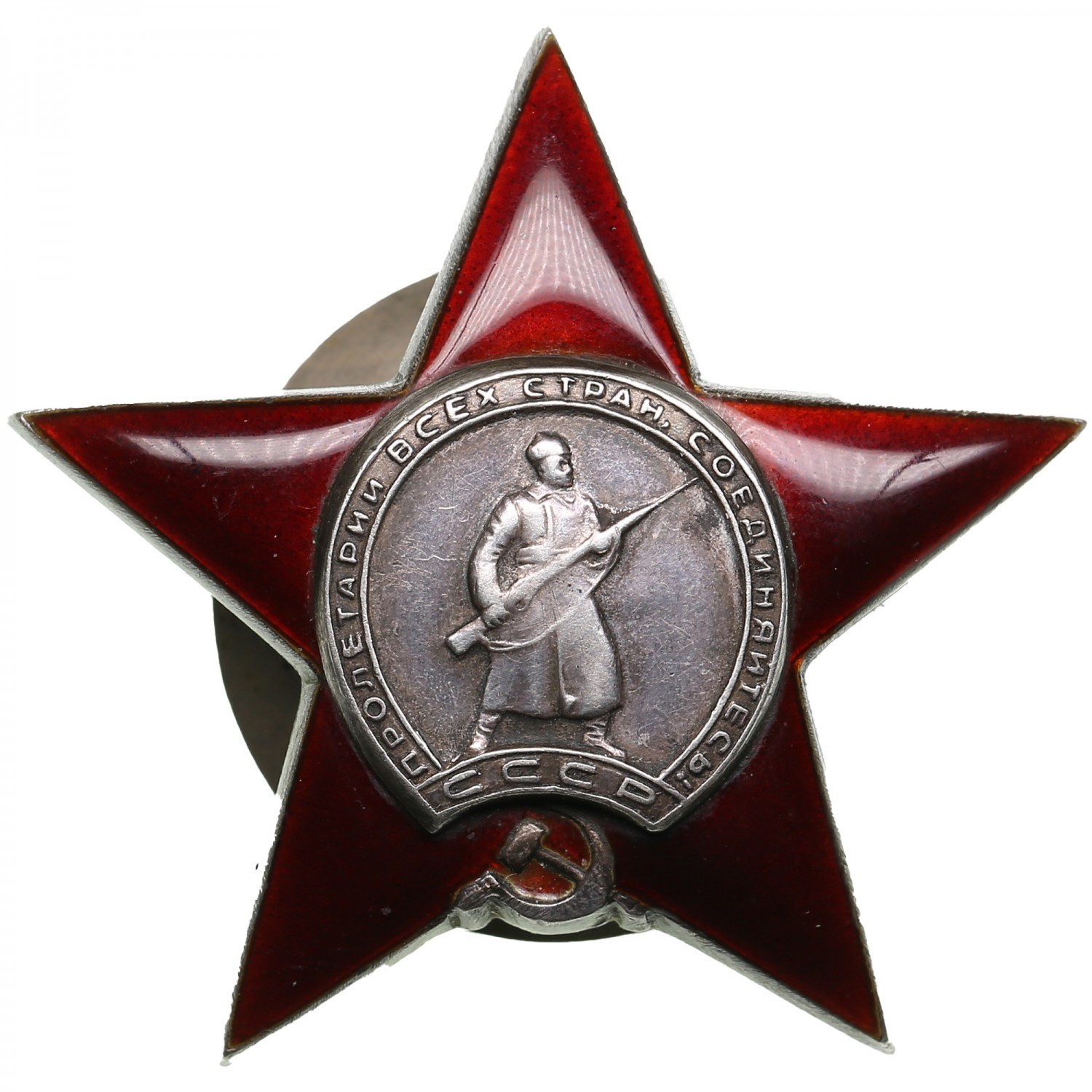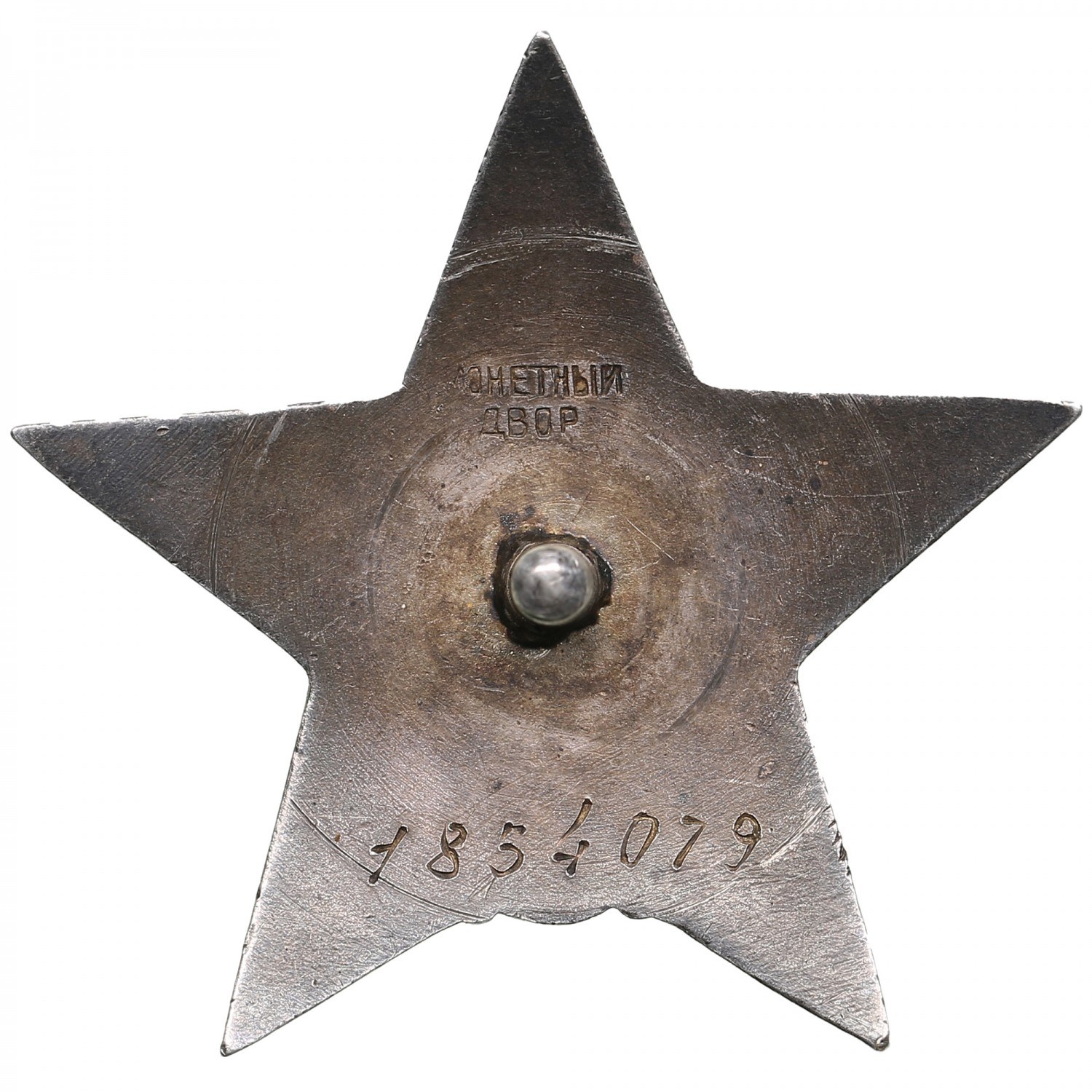 37.66g. Ag 0.925. 48mm. Type 3, Variant 2, Variety 5. Instituted by decree of the Presidium of the Central Executive Committee on 6 April 1930; the statute approved on 5 May 1930, with later amendments in 1936, 1943, 1946, 1947, and 1980. Awarded for outstanding service in the defense of the USSR both in war and peacetime, as well as for ensuring state security. Recipients included members of the Red Army, Navy, Border and Internal Troops, NKVD and KGB officers, as well as military units, ships, institutions, and occasionally foreign servicemen. The five-pointed silver star is covered with ruby-red enamel. In the center — a relief of a Red Army soldier with rifle, surrounded by the motto “Proletarians of all countries, unite!” and the inscription “USSR” below. On the reverse — screwback with nut for attachment. Designed by V. Kupriyanov and V. Golenecki. The first recipient was Marshal Vasily Blyukher in 1930. By 1941 over 21,500 awards were made; during World War II, more than 2.86 million decorations were issued. Worn on the right side of the chest, after the Order of the Patriotic War 2nd Class.
