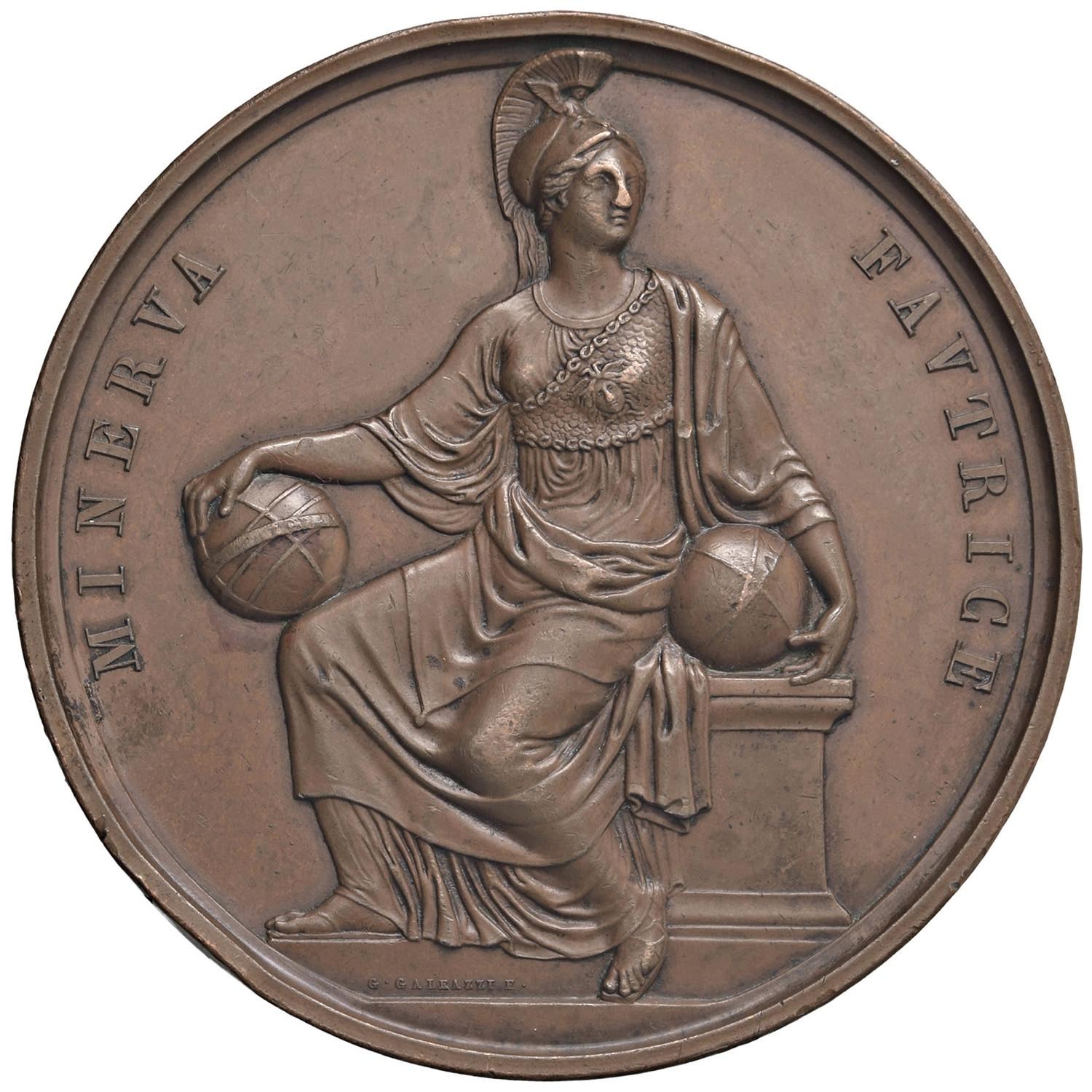 MEDAGLIE DEI SAVOIA Carlo Alberto (1831-1849) Medaglia 1840 - Per il congresso degli scienziati Italiani a Torino, Minerva seduta - Opus: G. Galeazzi - Camossi-Vertova pag. 75/471- AE (g 156 - Ø 73 mm) Colpo al bordo comunque molto rovinato