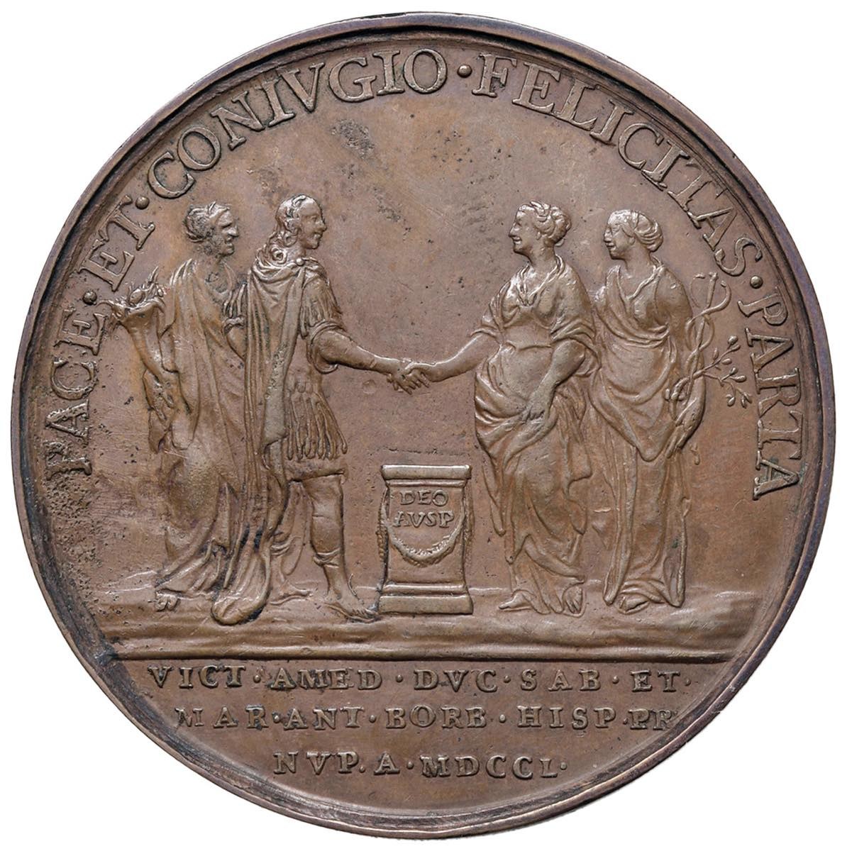 MEDAGLIE DEI SAVOIA-REGNO DI SARDEGNA. Carlo Emanuele III (1730-1773) Medaglia 1750 Ricordo del matrimonio tra il figlio di Carlo Emanuele, Vittorio Amedeo III, e Maria Antonia Borbone, figlia di Filippo V - Opus: L. Lavy - U. di S. n. 17 - R - AE (g 59,17 - Ø 52,5 mm) Colpetto al bordo e alcuni minimi segnetti di contatto