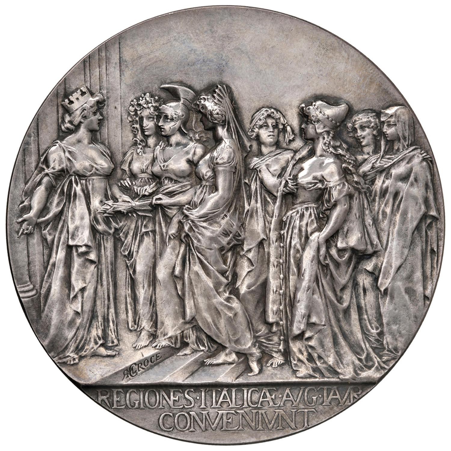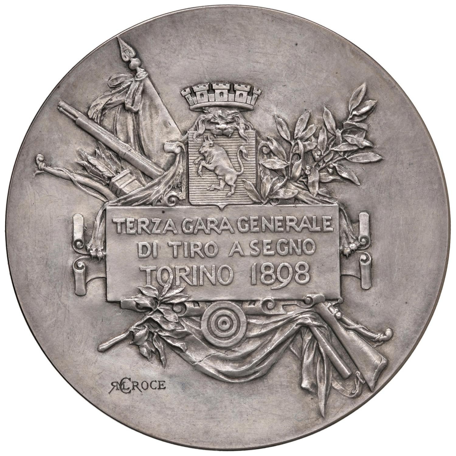 SAVOIA Durante Umberto I (1878-1900) Medaglia 1898 Per la III Gara generale di Tiro a Segno in Torino - Opus: Renè Lancelot Croce, esimia cesellatrice e medaglista - RRR - AG (g 101,46 - Ø 61 mm) Estremamente rara in argento, opera della grandissima artista italo-francese