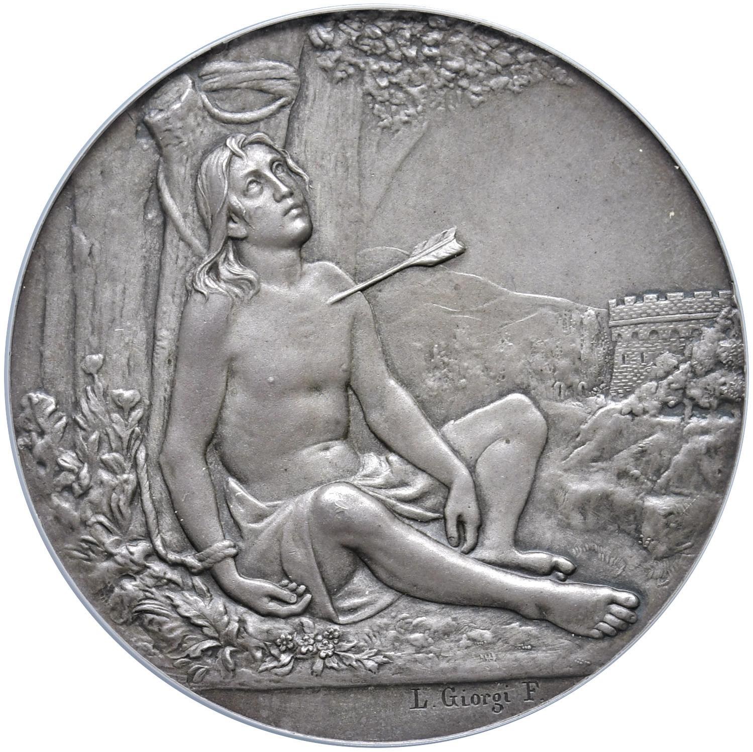 SAVOIA San Sebastiano Martire Medaglia coniata 1900 Arciconfraternita della Misericordia di Firenze, sotto Vittorio Emanuele II di Savoia principe di Napoli - Opus: L. Giorgi - AG (Ø 60 mm) Rarissima medaglia in slab NGC MS 65 cod. 6635546-011
