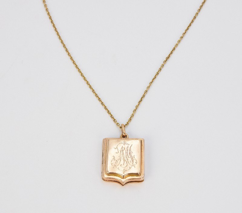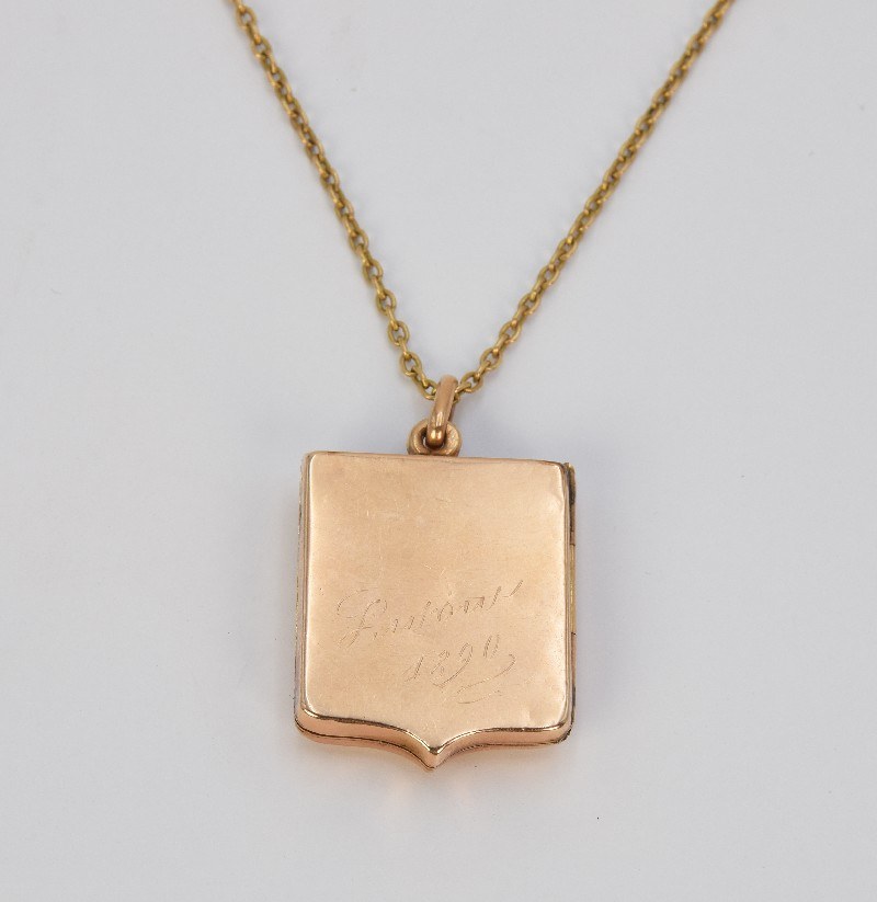 forma wisiora, otwierany, z grawerowanym monogramem na awersie MJ oraz na rewersie Lwów 1890,