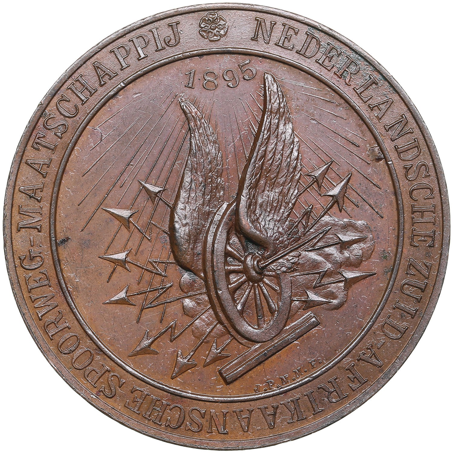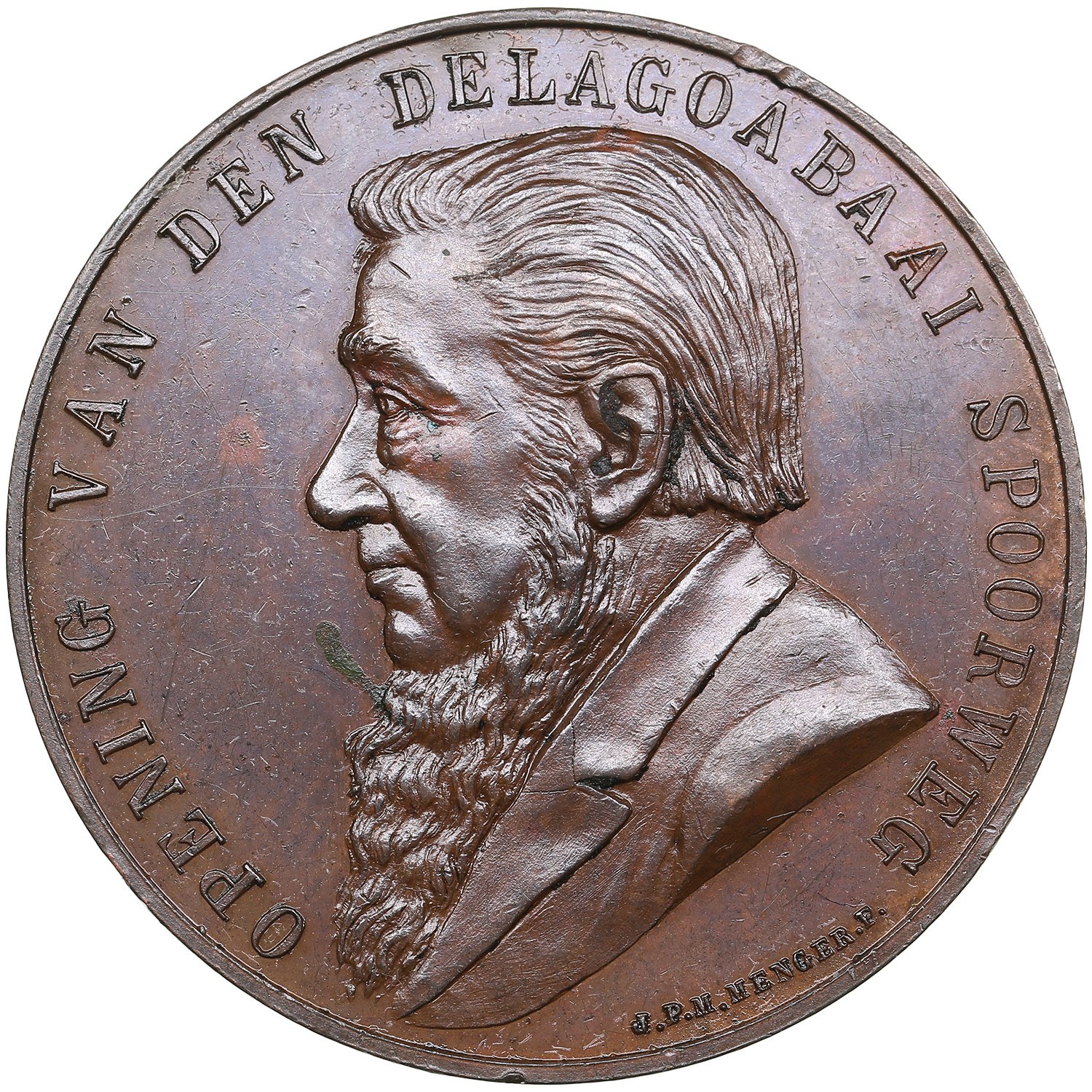 38.24g. 44mm. AU/UNC. Obv.: Portrait of Paul Kruger left with circular inscription. "OPENING VAN DEN DELAGOABAAI SPOORWEG";Rev.: Wings of Hermes on cartwheel and arrows. "NEDERLANDSCHE ZUID-AFRIKAANSCHE SPOORWEG-MAATSCHAPPIJ".Medalier: Philip Mathias Menger. Zw. 1181; Moy 92 (52).