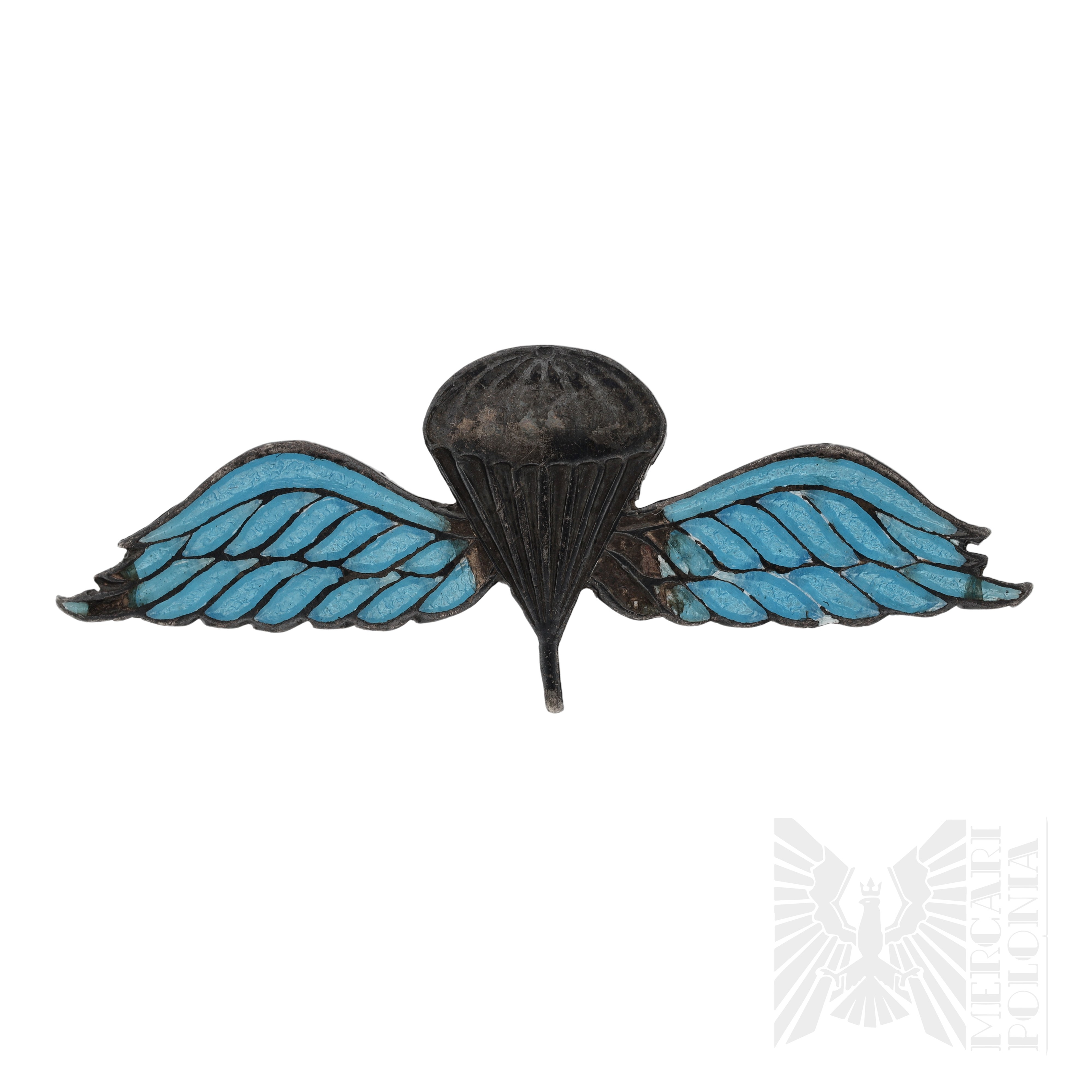 Oryginalna brytyjska broszka typu „sweetheart” z okresu II wojny światowej, przedstawiająca skrzydła spadochronowe, wykonana ze srebra pokryte niebieską emalią. Rewers sygnowany „silver”. Elegancki egzemplarz datowany na początek lat 40. XX wieku.