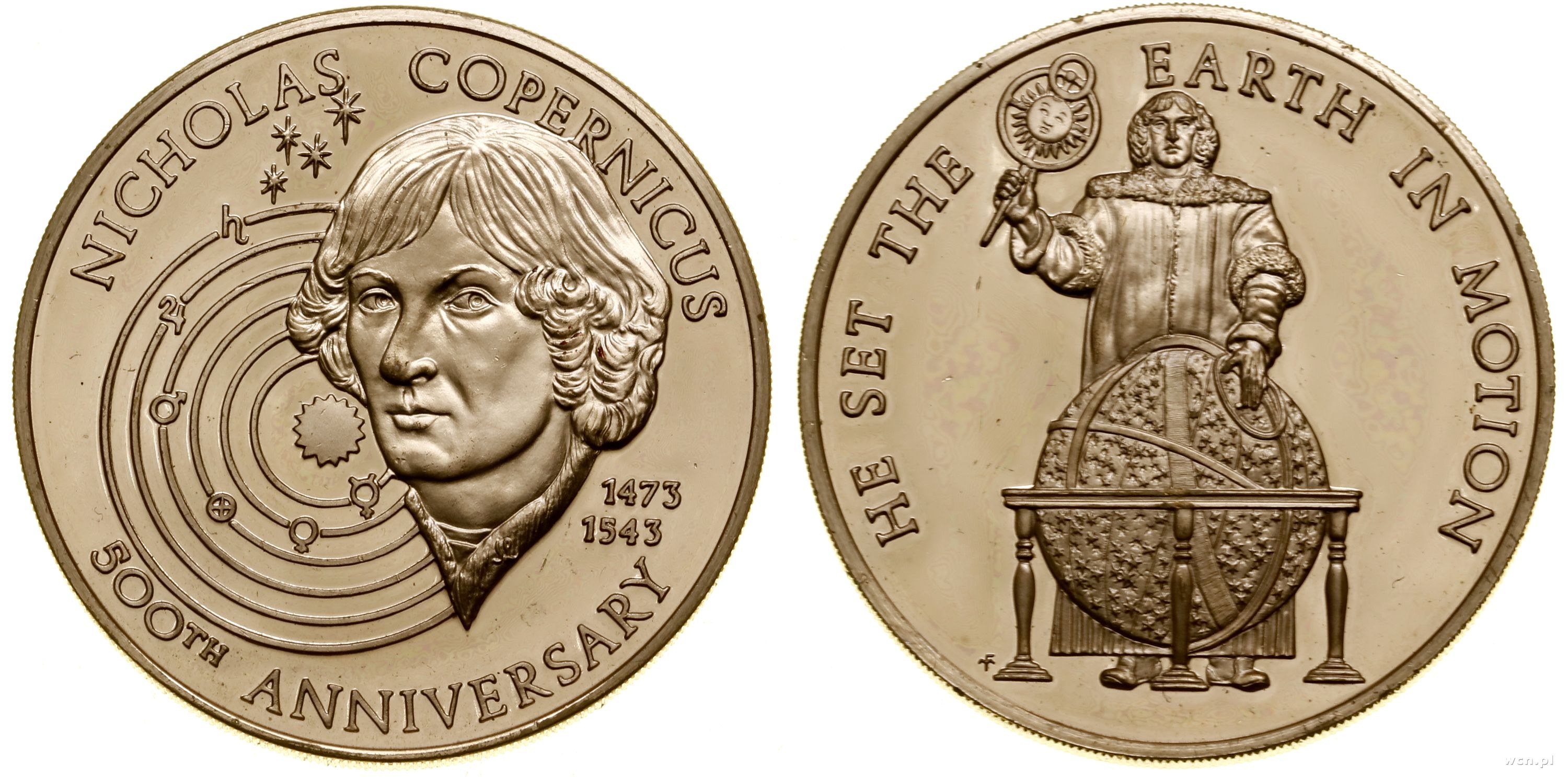 Aw: Głowa lekko w lewo, po lewej układ słoneczny, po prawej 1473 / 1543, NICHOLAS COPERNICUS - 500TH ANNIVERSARY, Rw: Postać ze słońcem, stojąca za astrolabium, HE SET THE - EARTH IN MOTION