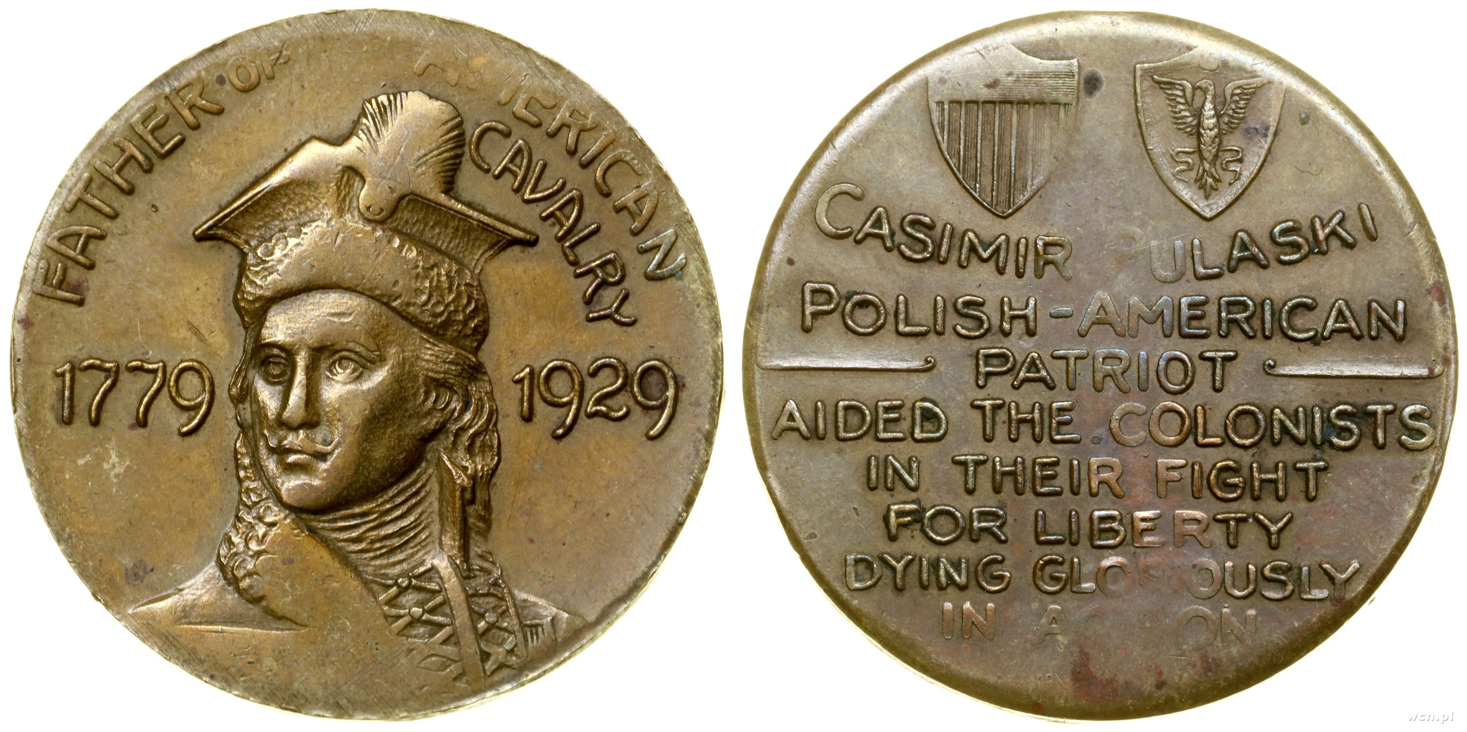 Aw: Popiersie Pułaskiego z głową nakrytą konfederatką 3/4 w lewo, w otoku FATHER OF AMERICAN CAVALRY, z boków 1779 - 1929, Rw: Tarcze z herbami USA i Polski, w 8 wierszach: CASIMIR PULASKI / POLISH AMERICAN / PATRIOT / AIDED THE COLONIST / IN THEIR FIGHT / FOR LIBERTY / DYING GLORIOUSLY / IN ACTION