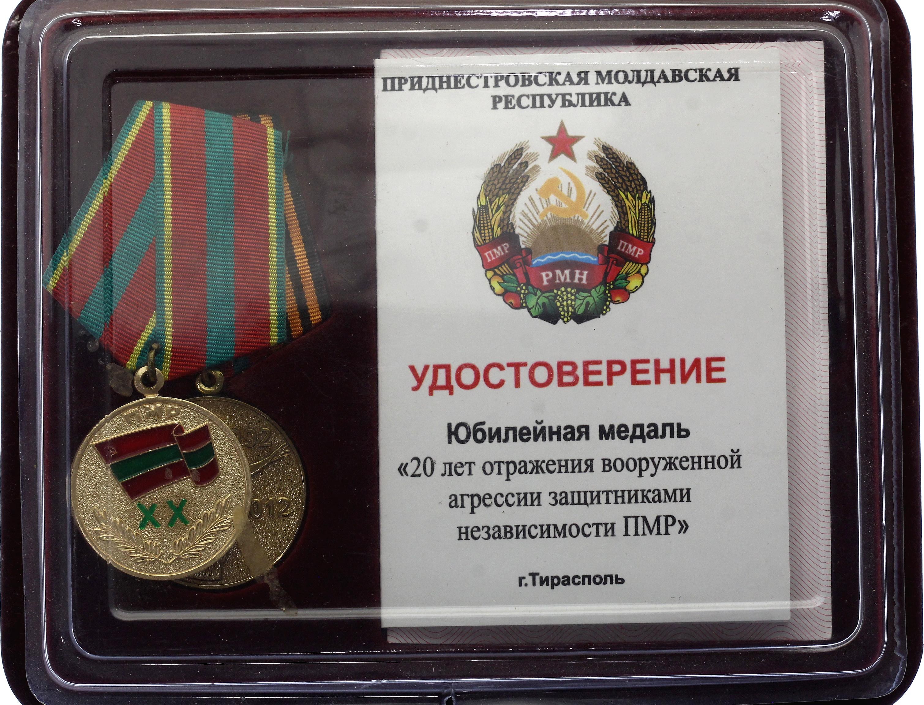 "20 Years of Repulsing Armed Aggression by the Defenders of the Independence of the Transnistria"; With documents for one recipient; In original box