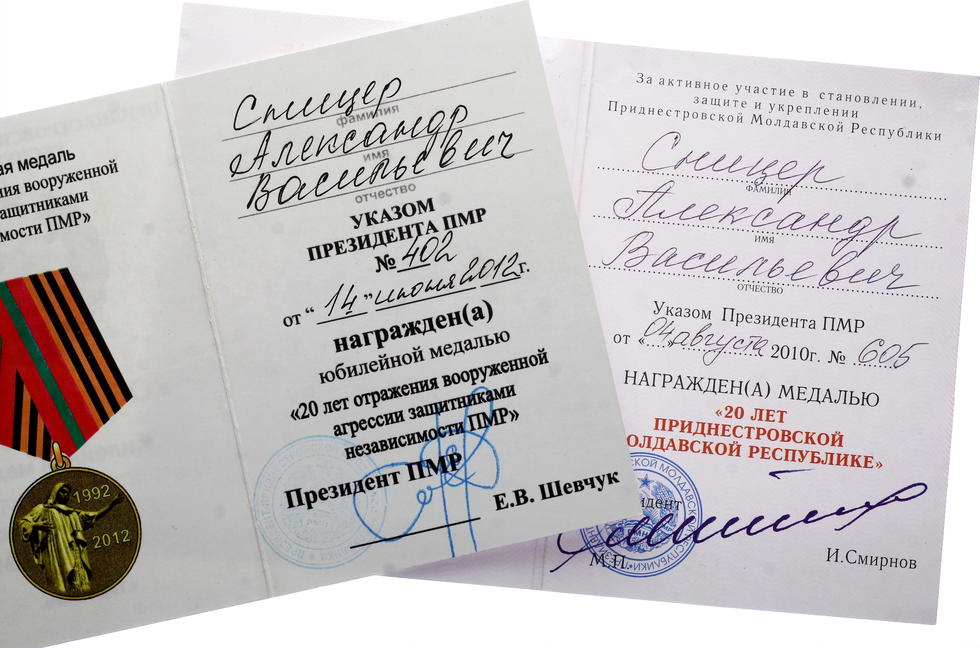 Transnistria Set of 2 Medals with Documents