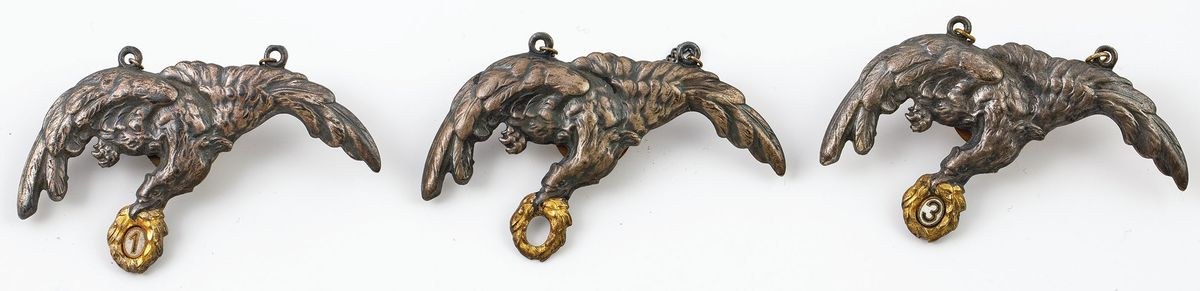 Biały metal, złocenie, emalia, dł. 65 mm, kontra słupek, łańcuszek, nakrętka sygnowana: Mennica Państwowa