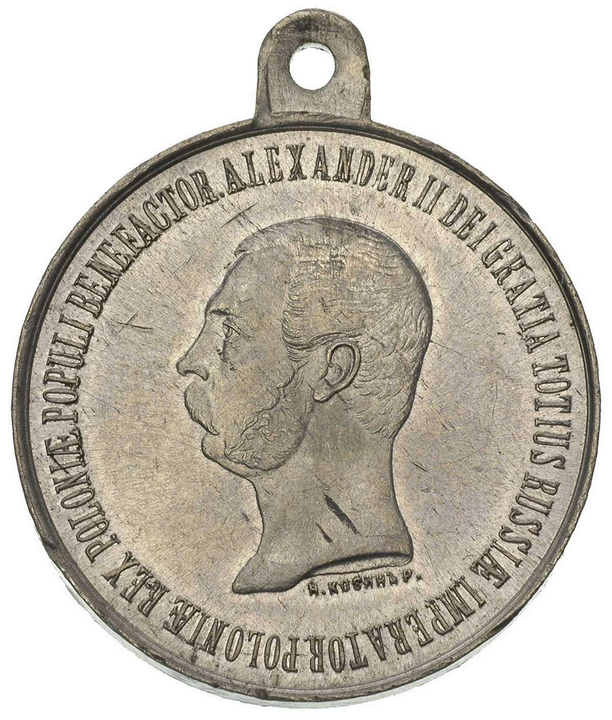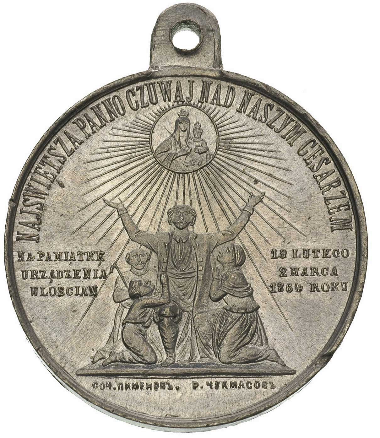 POLSKA, uwłaszczenie włościan w Królestwie Polskim 1864 r- medal autorstwa Kozina, Pimienowa i Czukmasowa, Aw: Popiersie Aleksandra II w lewo i napis w otoku, Rw: Chłopi modlący się przed obrazem Matki Boskiej Częstochowskiej i napis, H-Cz.6757, cynk 36 mm, zawieszka