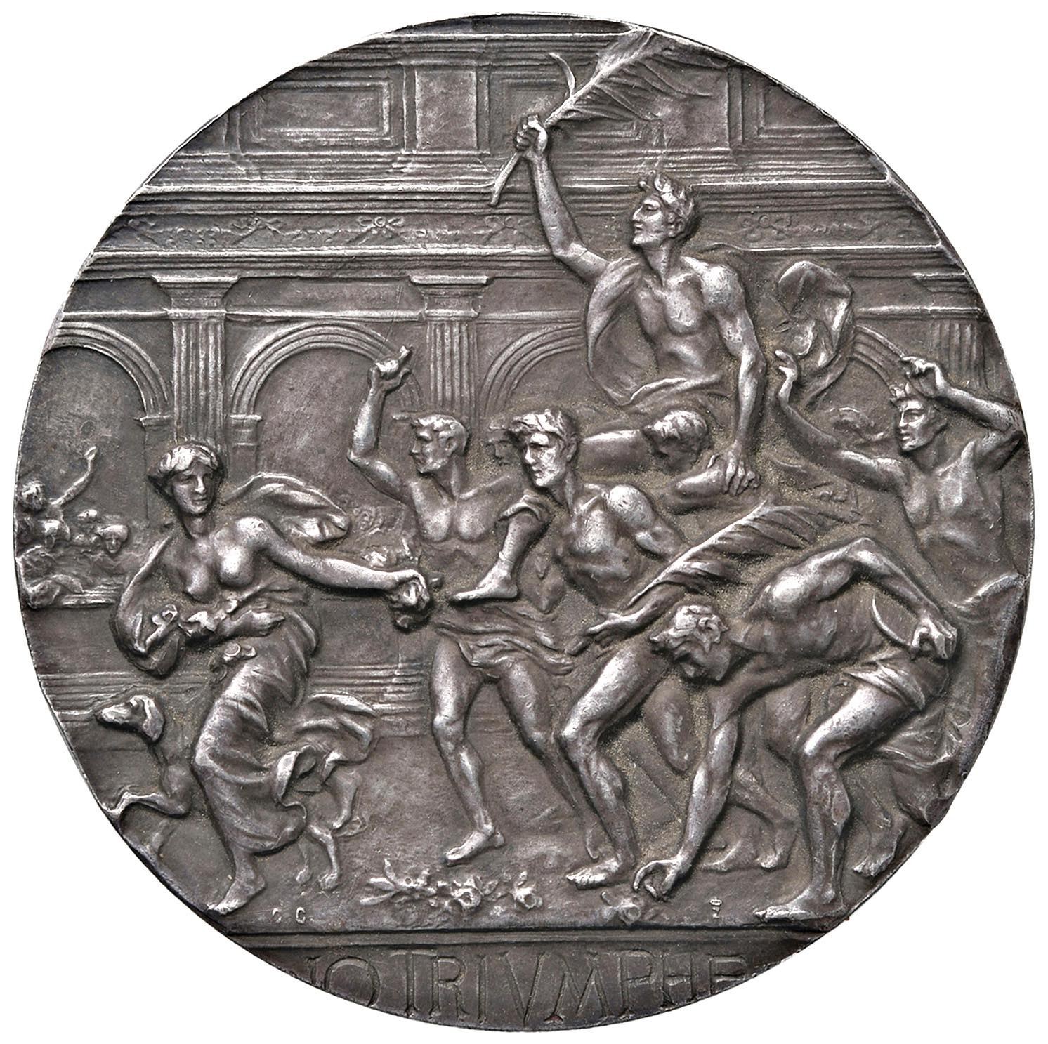 REGNO D'ITALIA Medaglia senza data (1905) Ministero della Guerra Il Trionfo, rappresentazione artistica - Opus: Giannino Castiglioni, edizione Johnson - RR - AG (g 107,15 - Ø 60 mm) Medaglia assai rara in argento. Colpetto al bordo
