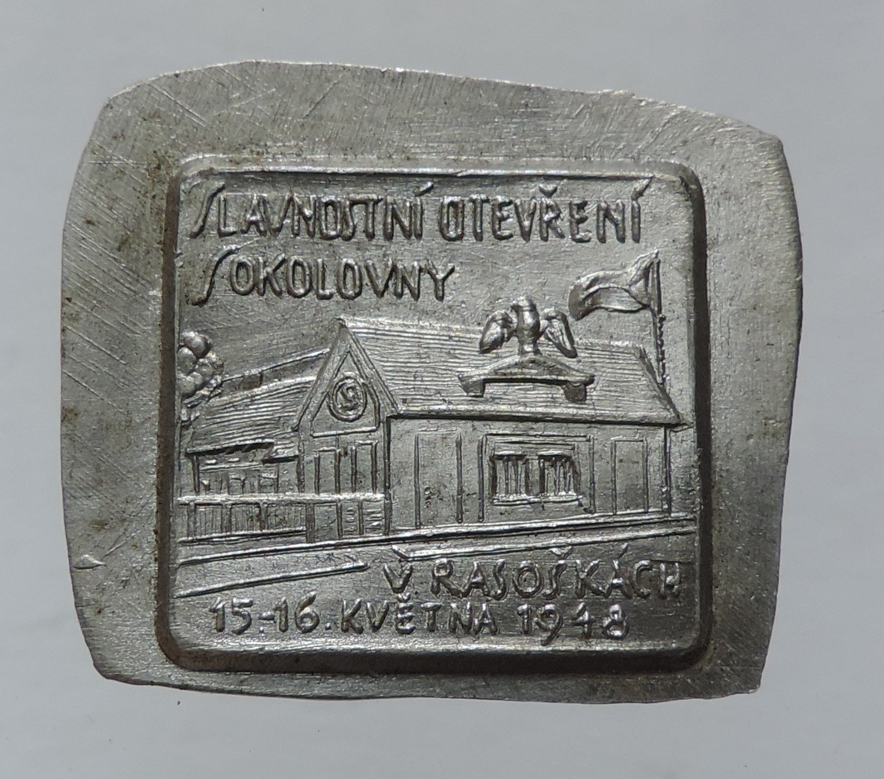 sokolský odznak Sokolovna v Rasoškách 1948 jednostr., neúplná ražba