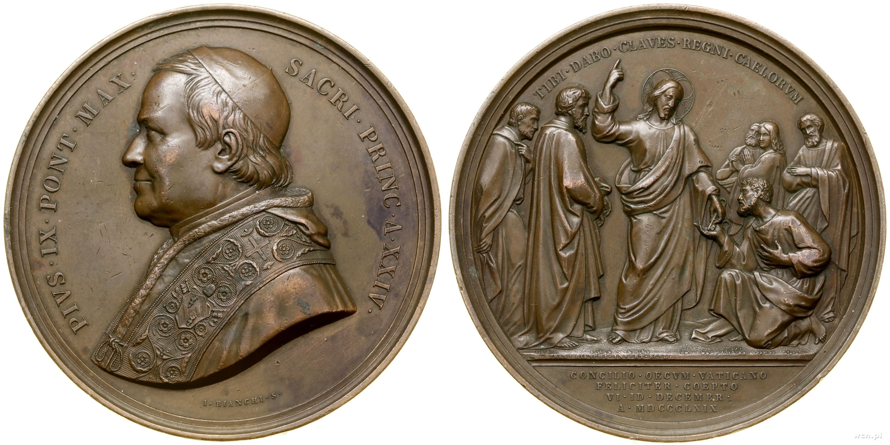 Aw: Popiersie w lewo, niżej sygnatura I • BIANCHI • S •, PIVS • IX • PONT • MAX • - SACRI • PRINC • A • XXIV •, Rw: Jezus wśród apostołów, przekazujący klucze św. Piotrowi, niżej sygnatura FRAN • BIANCHI • INV • ET • SCUL •, TIBI • DABO • CLAVES • REGNI • CAELORVM, w odcinku CONCILIO • OECVM • VATICANO / FELICITER • COEPTO / VI • ID • DECEMBR • / A • MDCCCLXIX