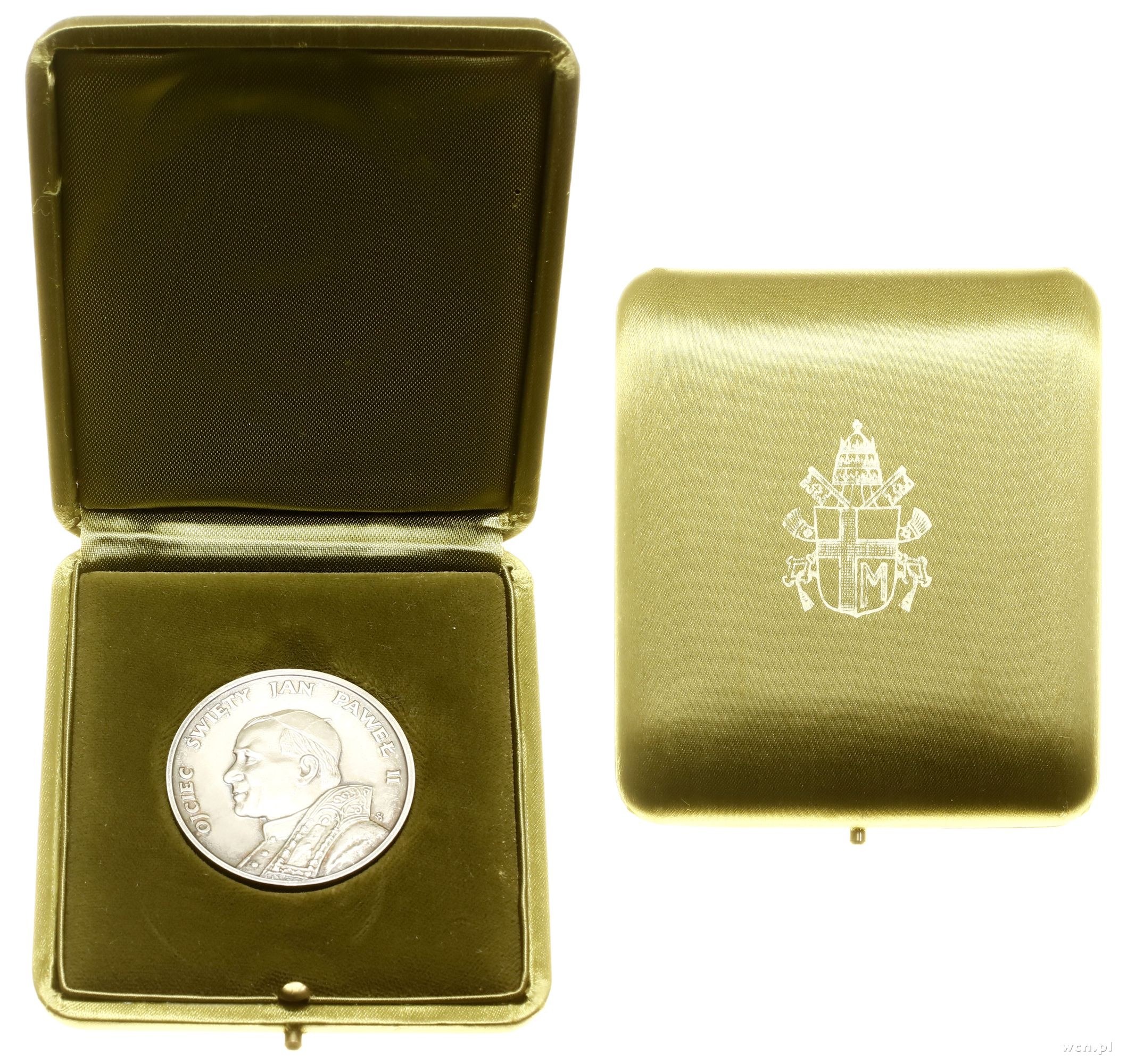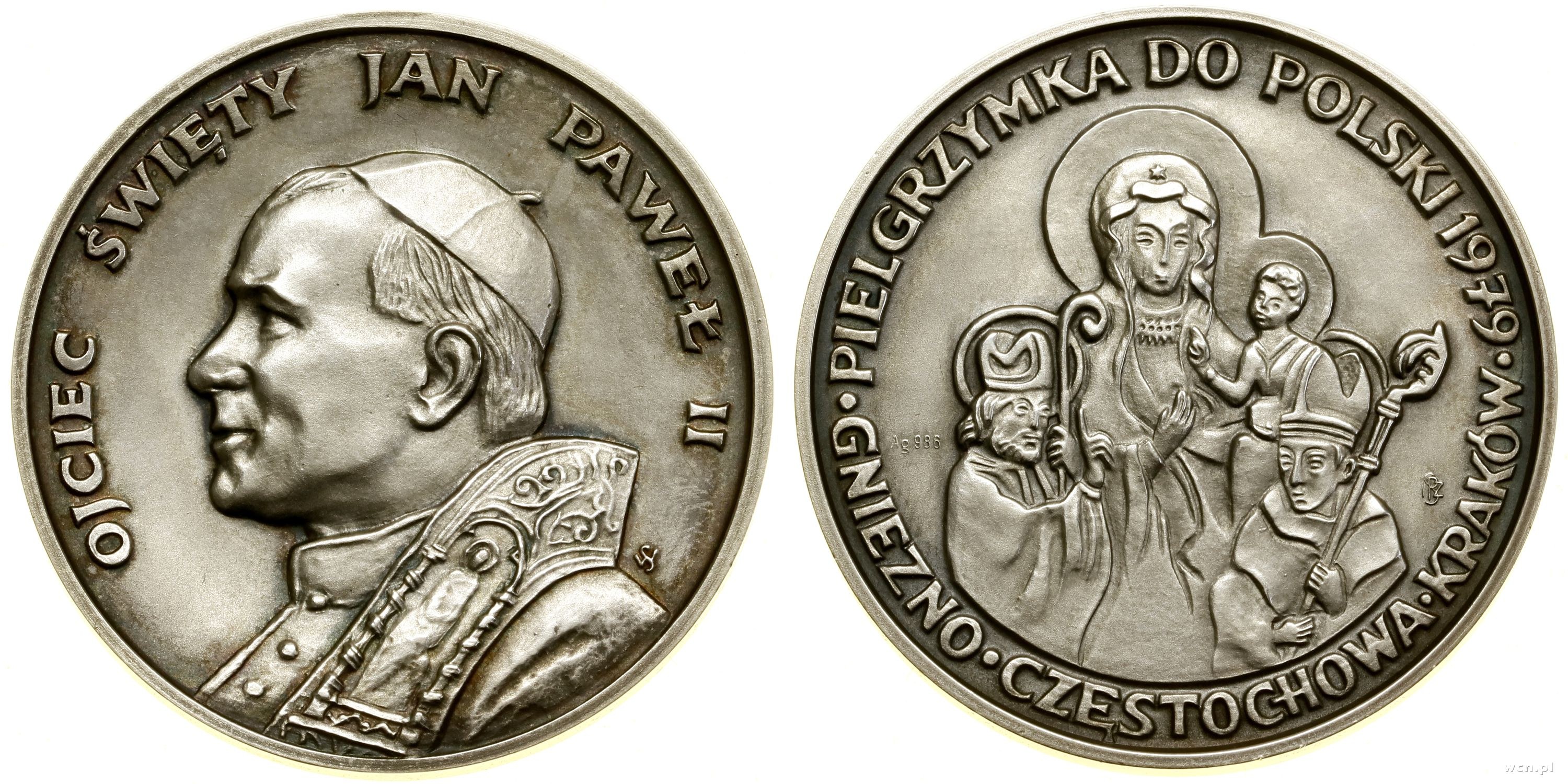 Aw: Popiersie papieża w lewo i napis w otoku OJCIEC ŚWIĘTY JAN PAWEŁ II, Rw: Matka Boska z Dzieciątkiem, z boków św. Wojciech i św. Stanisław, w otoku PIERWSZA PIELGRZYMKA DO POLSKI 1979, GNIEZNO CZĘSTOCHOWA KRAKÓW, projektowała Stanisława Wątróbska
