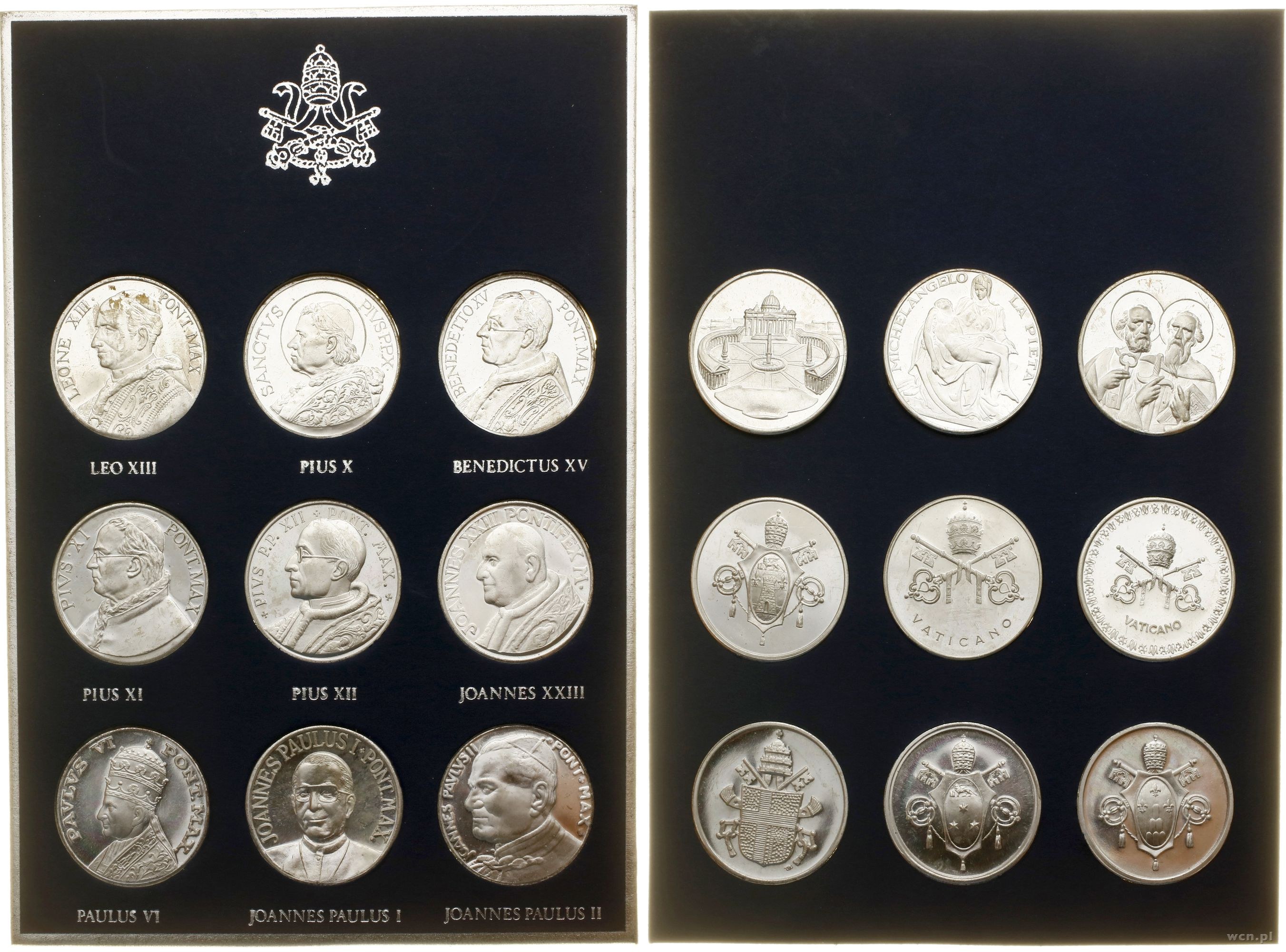Zestaw 9 medali z papieżami: Leonem XIII, Piusem X, Benedyktem XV, Piusem XI, Piusem XII, Janem XXIII, Pawłem VI, Janem Pawłem I i Janem Pawłem II