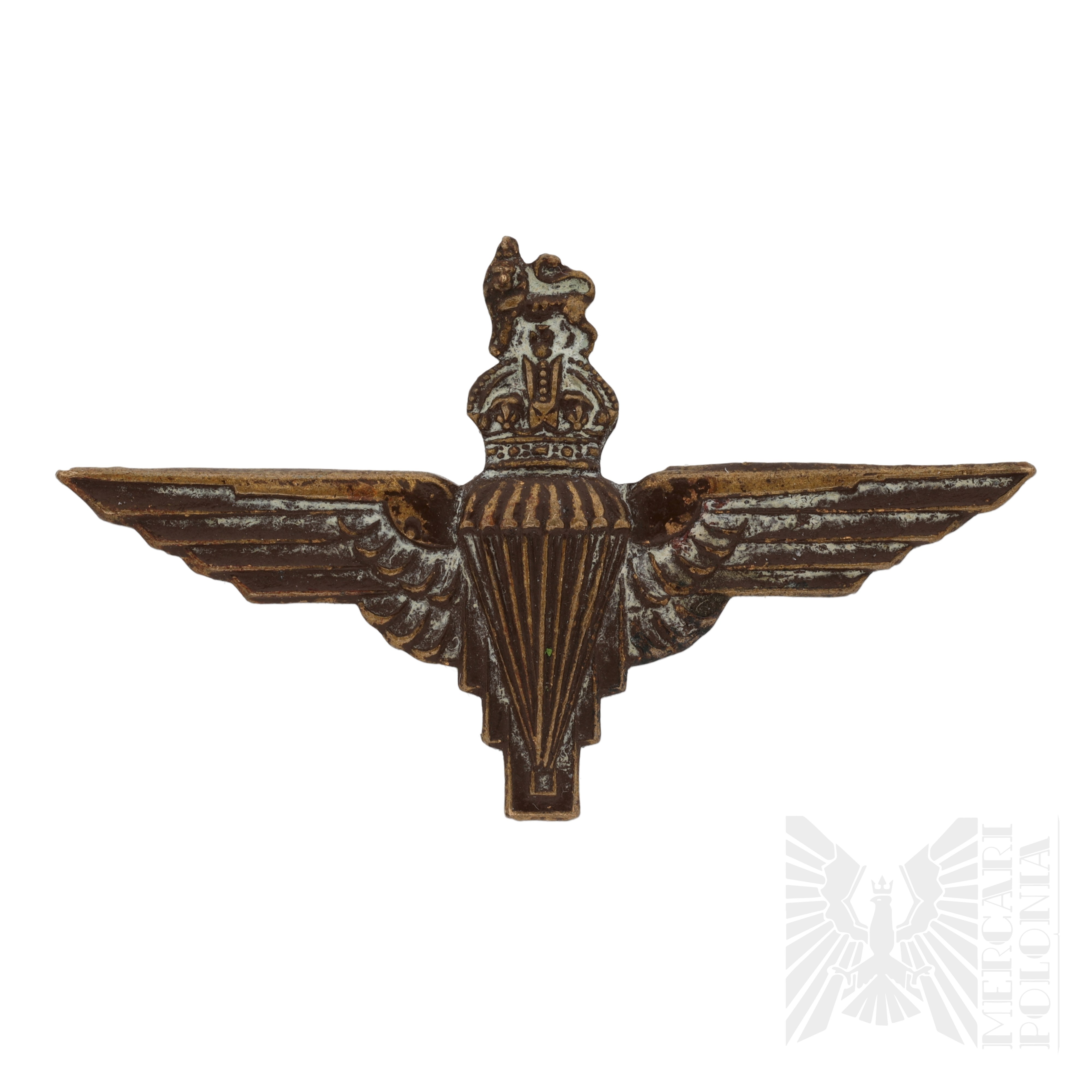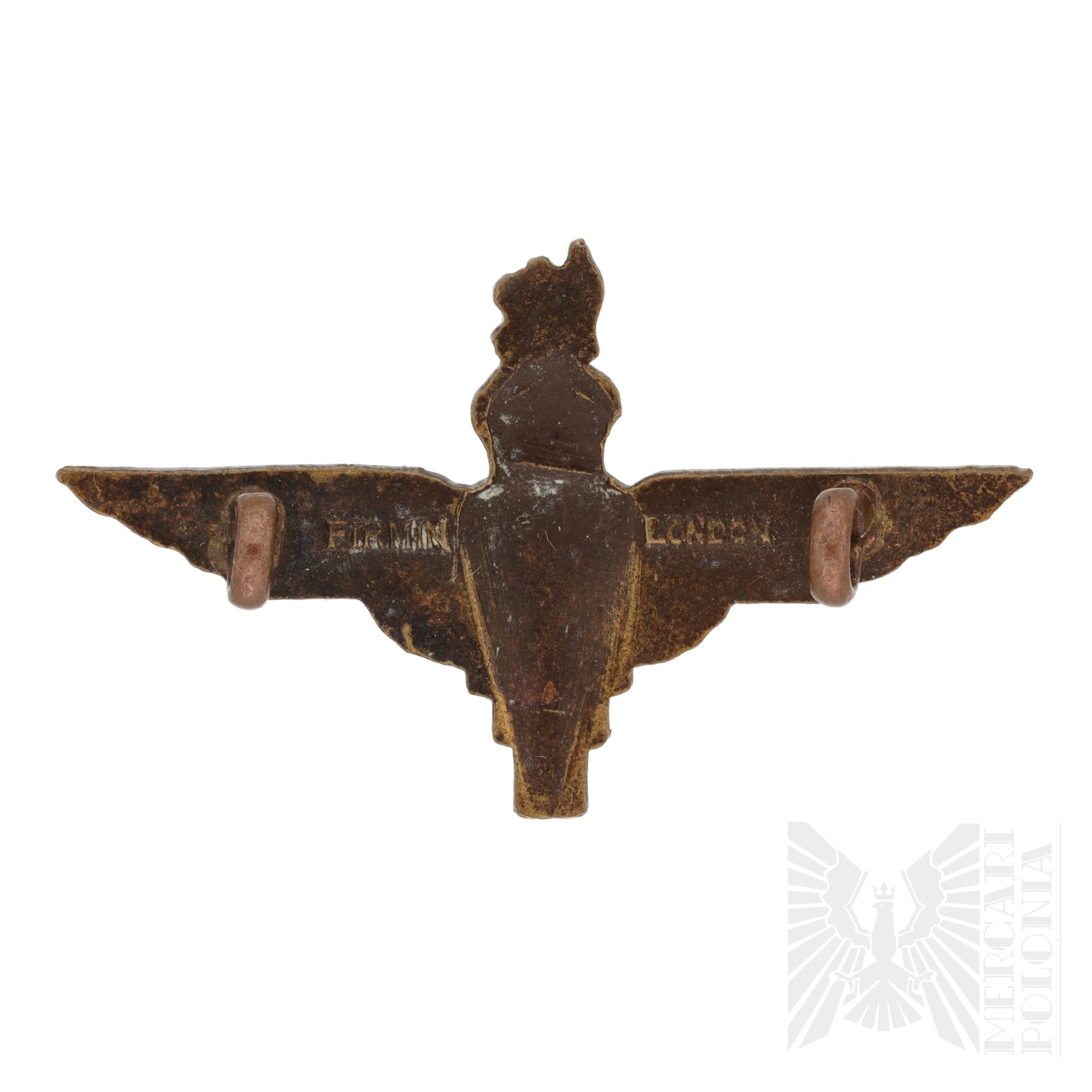 Brytyjskie skrzydełka spadochroniarza z II wojny światowej. Wspaniałe metalowe skrzydło spadochronowe z królewską koroną. Sygnowana “London Firmin”