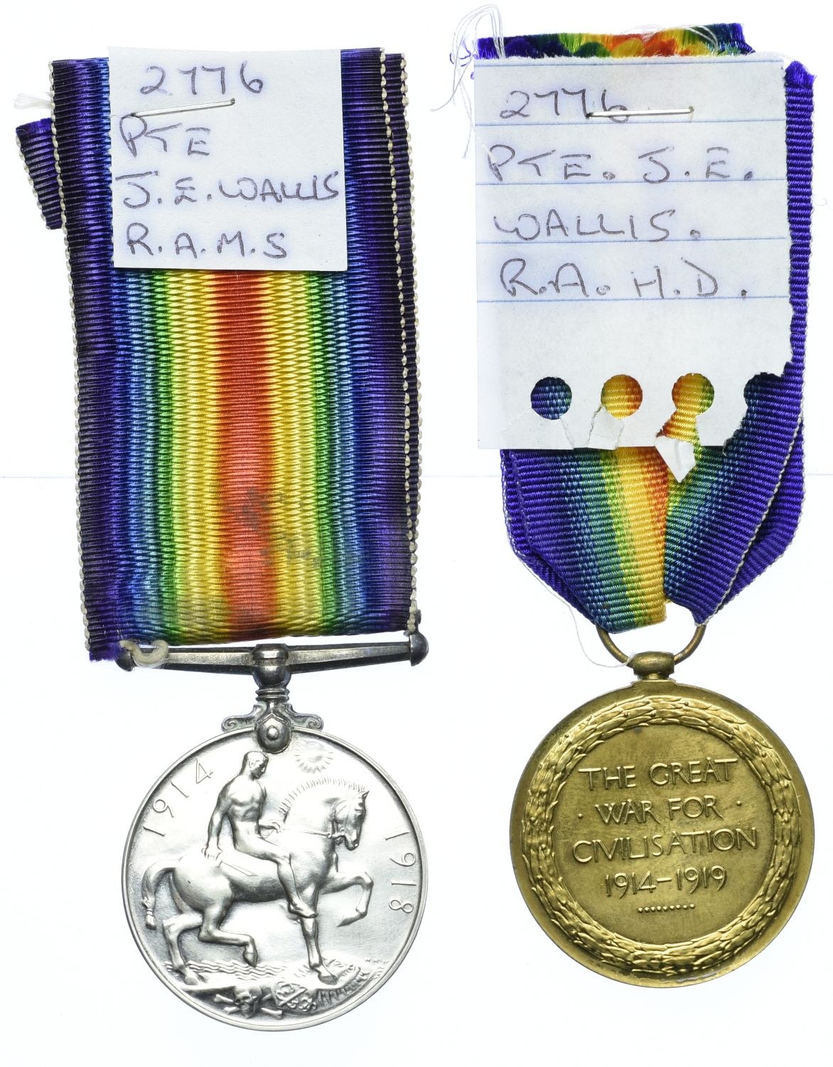 1. Medal Wojenny Brytyjski, 1914-1918 - srebro, średnica 36mm, oryginalna wstążka, grawer na rancie: 2776 PTE. J.E. WALLIS. R.A.M.C.