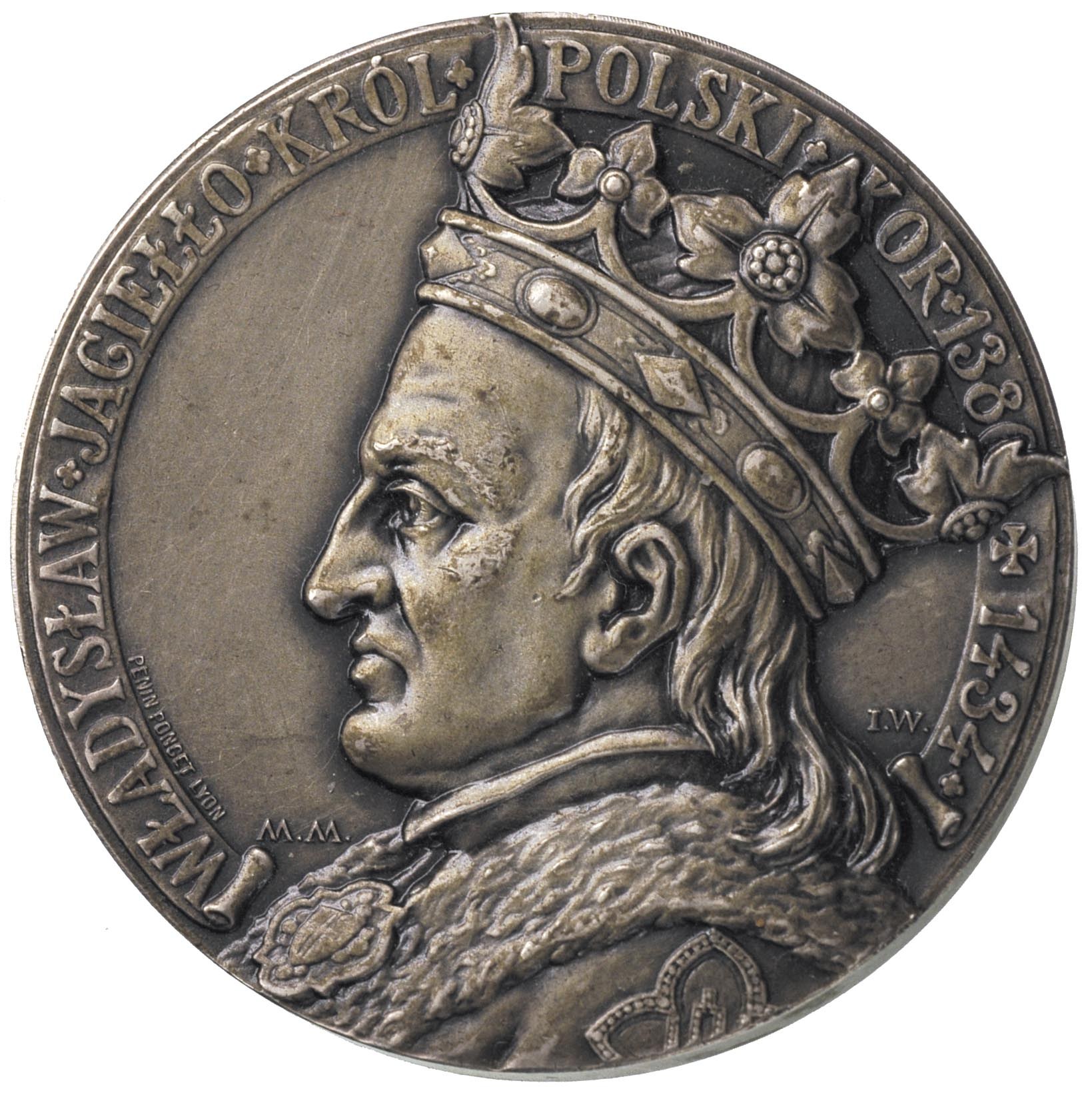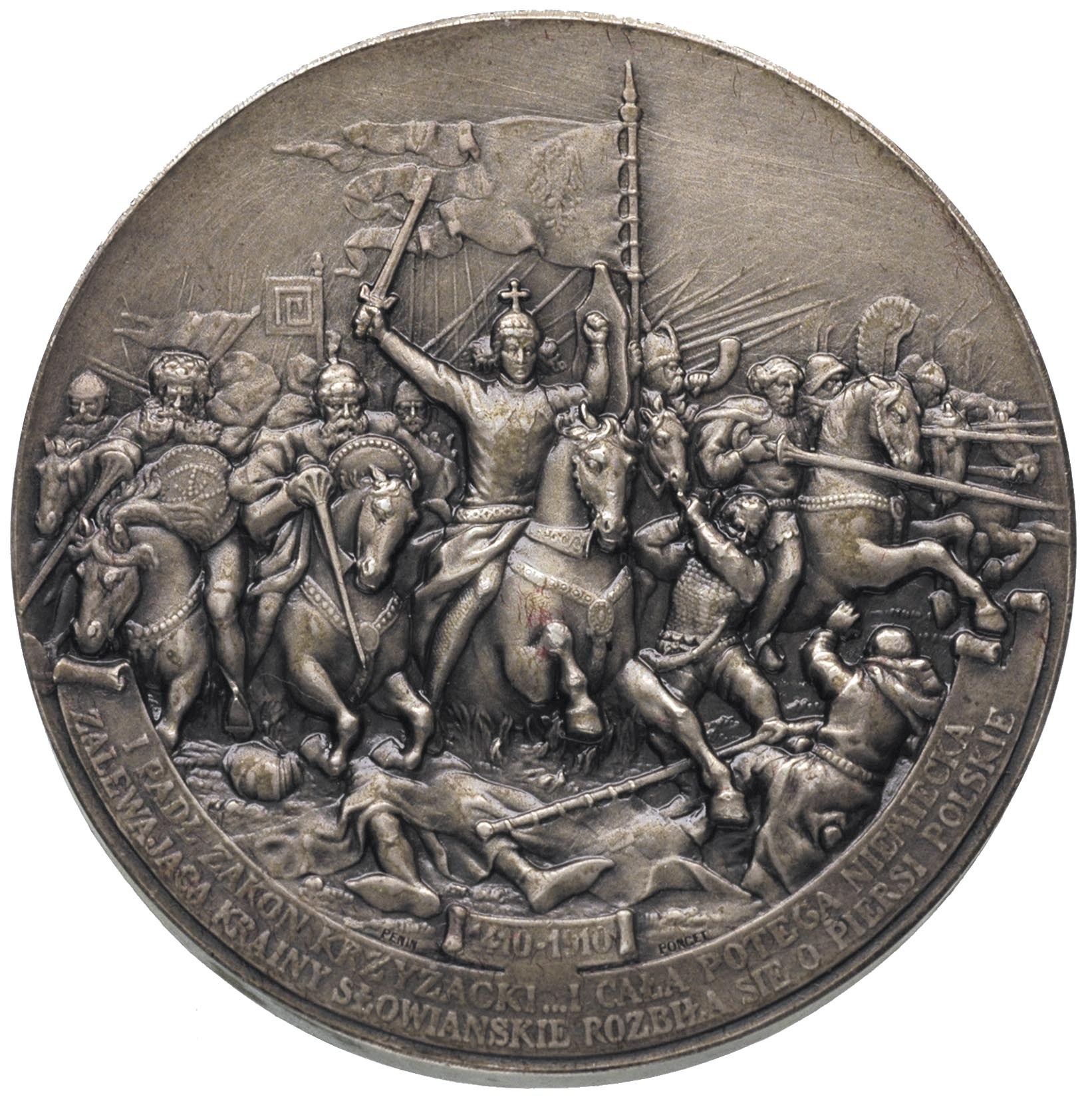 POLSKA, Władysław Jagiełło-medal autorstwa Ignacego Wróblewskiego i Michała Hankielewicza, wykonany przez Penin Ponceta w Lyonie 1910 r., Aw: Popiersie w lewo i napis w otoku, Rw: Fragment bitwy, napis u dołu I PADŁ ZAKON KRZYŻACKI, srebro 79.11 g, 50 mm, na rancie napis: ARGENT i punce, Strzałkowski 151