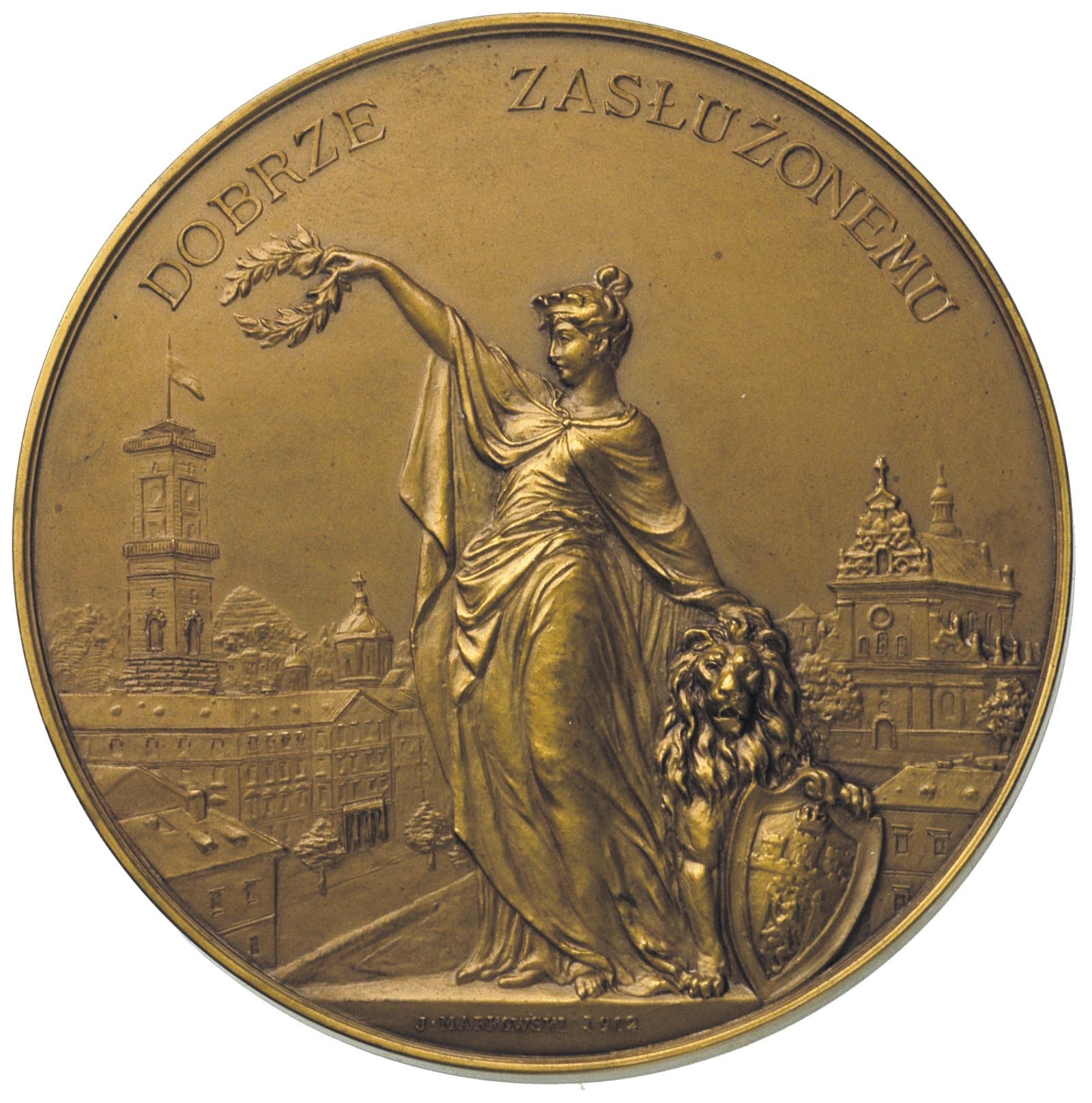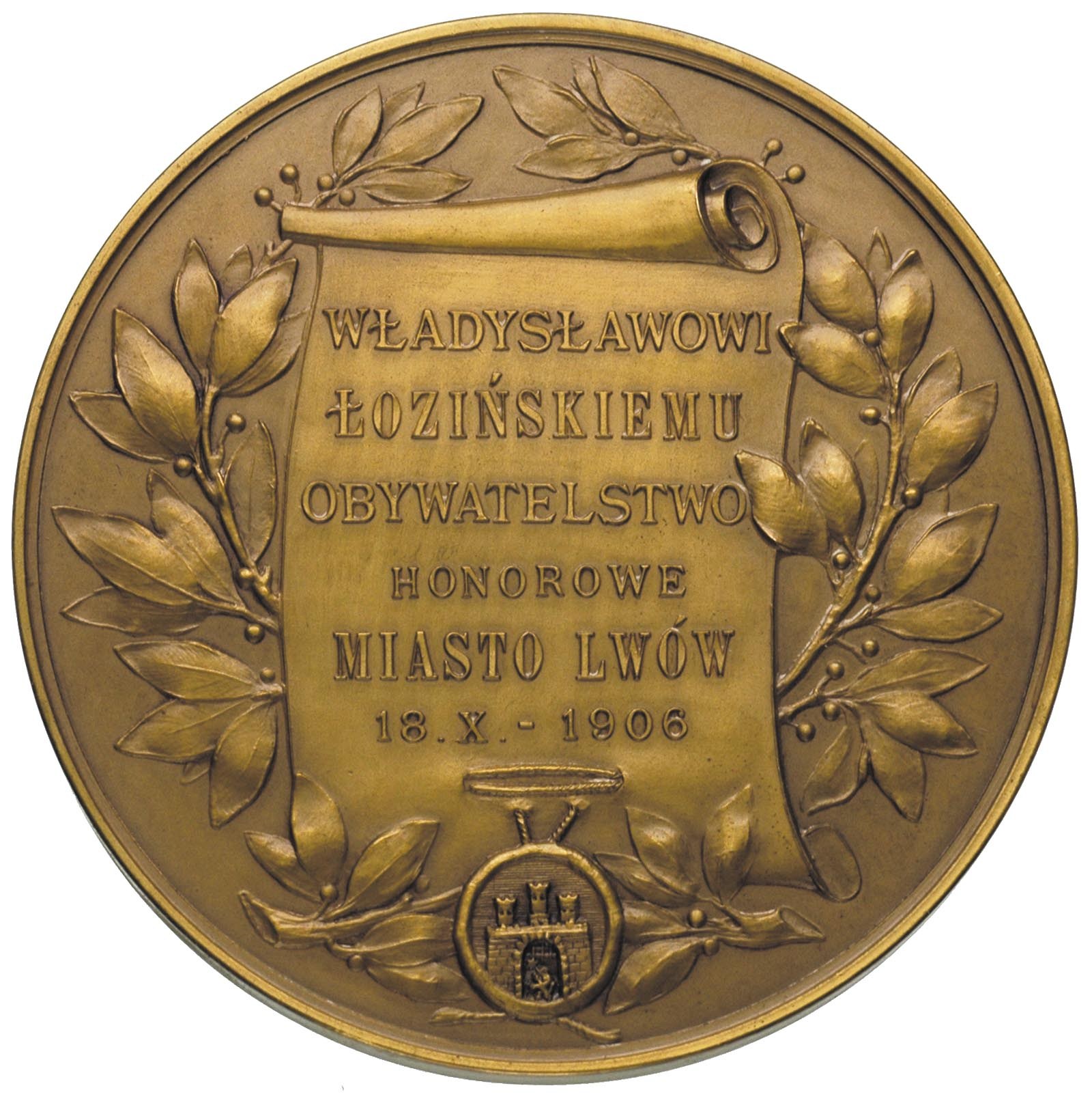 POLSKA, Władysław Łoziński-medal autorstwa J. Markowskiego 1906 r., Aw: Na ozdobnym kartuszu napis WŁADYSŁAWOWI ŁOZIŃSKIEMU OBYWATELSTWO HONOROWE MIASTO LWÓW 18.X.1906, u dołu herb Lwowa, Rw: Alegoryczna postać kobieca na tle Katedry i Ratusza we Lwowie i napis u góry DOBRZE ZASŁUŻONEMU, brąz 101.37 g, 64.4 mm, Strzałkowski 73