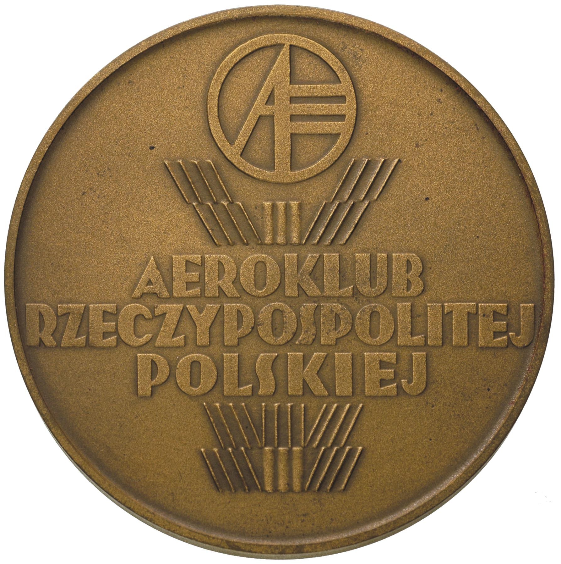 POLSKA, Zawody Gordon-Bennetta w Warszawie 1935 r., medal autorstwa Stanisława Repety, Aw: Skrzydlata postać kobieca wypuszcza z rąk balon, napis poziomy GORDON 1935 15.IX. BENNETT, u dołu sygn. SR, Rw: Pod znakiem Aeroklubu poziomy napis AEROKLUB RZECZPOSPOLITEJ POLSKIEJ, brąz 55 mm, Strzałkowski 773 RR