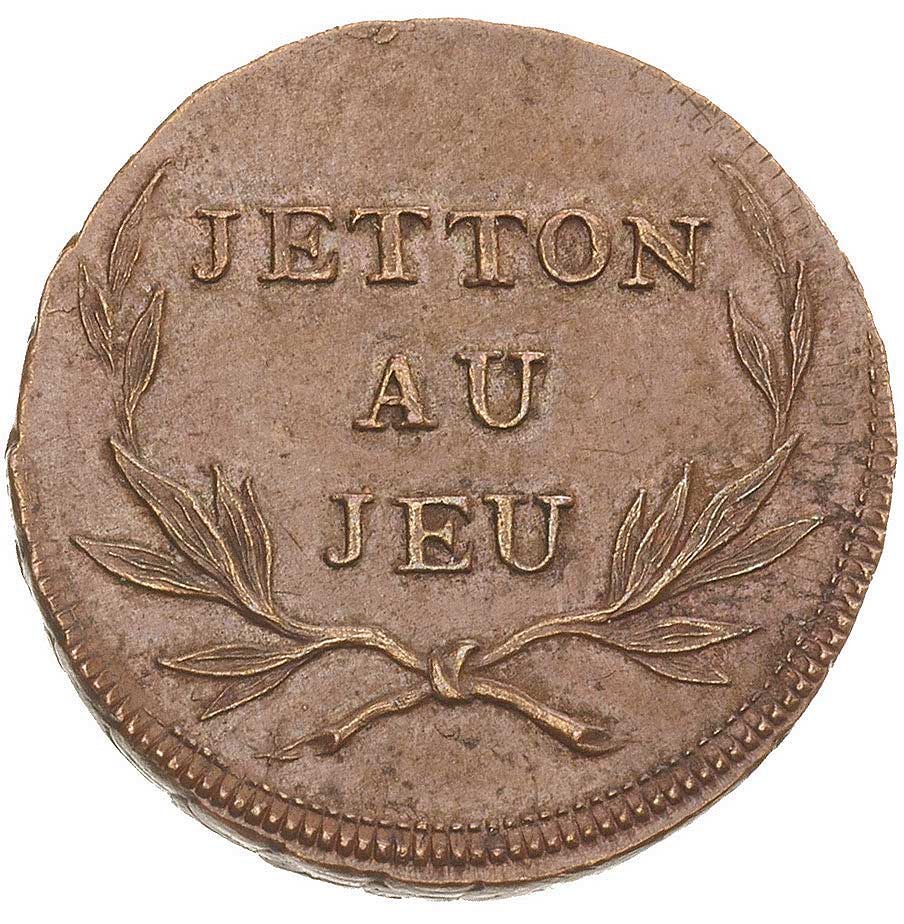 POLSKA, żeton do gry autorstwa J. F. Holzhaeussera lata 80-te XVIII w., Aw: Herb Nałęcz pod koroną hrabiowską, na nim ordery Orła Białego, Św. Stanisława i Krzyż Maltański, Rw: Napis JETTON AU JEU, niżej dwie gałązki oliwne Więcek 75, H-Cz.3948, brąz 30 mm, te 3 żetony należy łączyć z osobą hrabiego Raczyńskiego, a nie Rzewuskim ani Małachowskim jak chce Hutten-Czapski