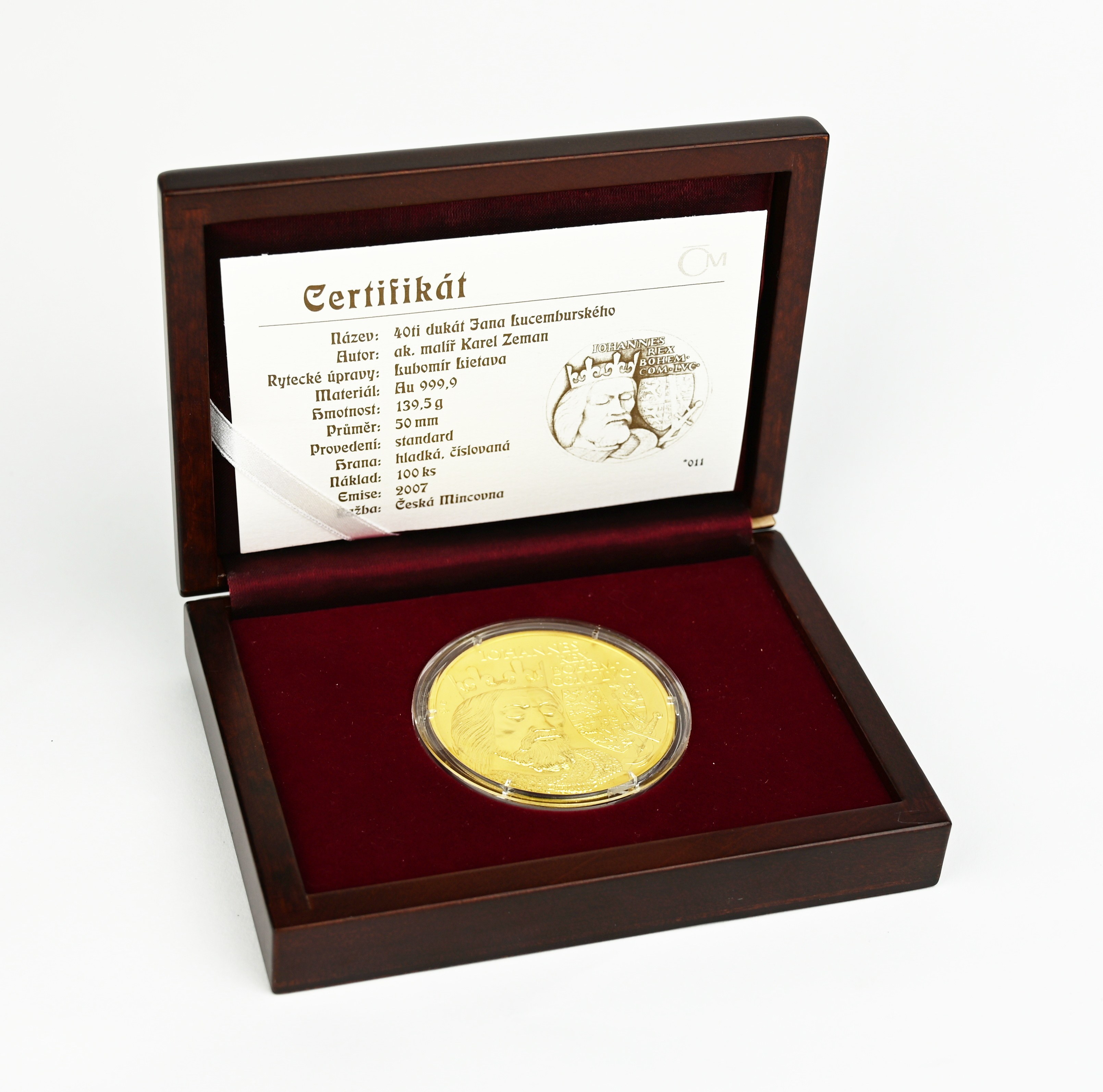 Zlatá číslovaná medaile Čtyřicetidukát Jana Lucemburského, 2007, BK, č. 011, 50 mm, 139,5 g Au 999,9/1000, náklad 100 ks, autor K. Zeman, Česká mincovna
